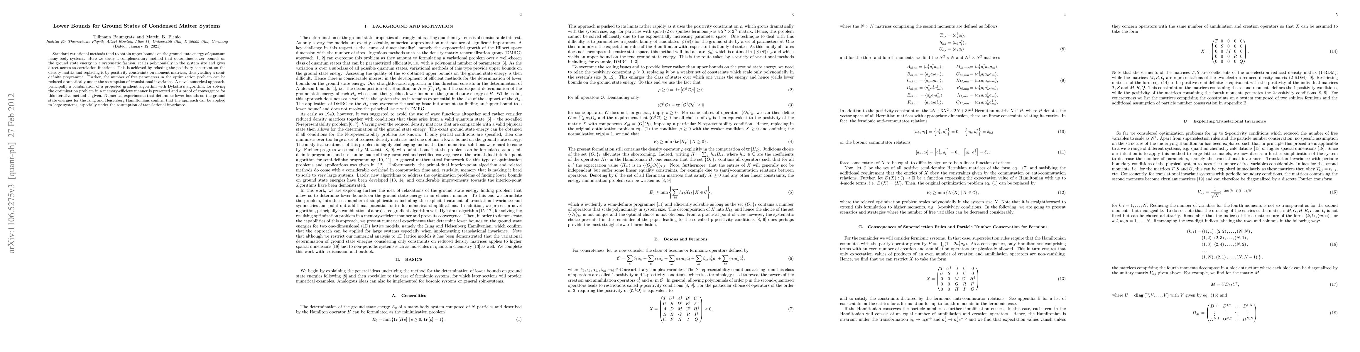 This paper introduces a systematic method for determining lower bounds on the ground state energy of quantum many-body systems, scaling polynomially with system size and providing direct access to correlation functions. The approach leverages semi-definite programming and a novel numerical method combining projected gradient and Dykstra's algorithms, validated through experiments on the Ising and Heisenberg models.
