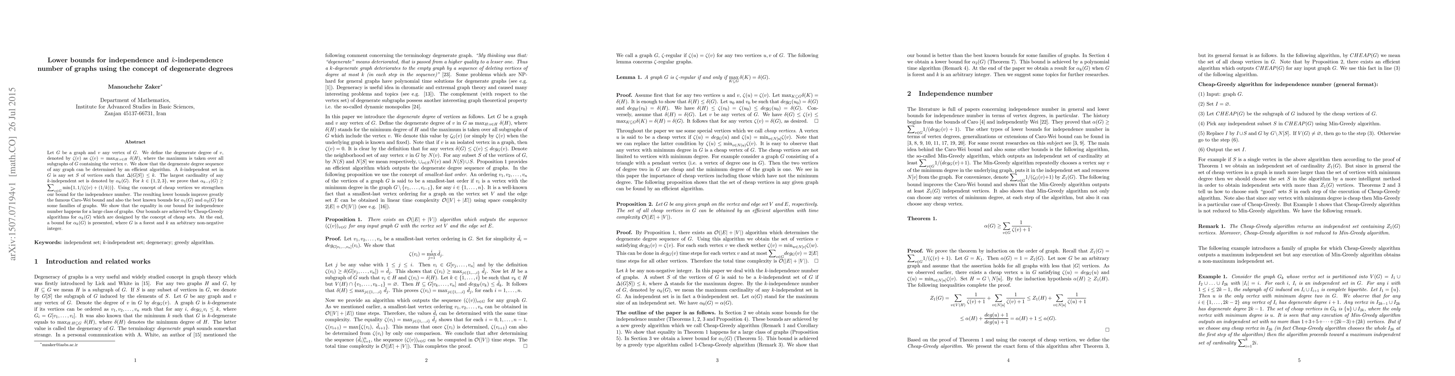 Let $G$ be a graph and $v$ any vertex of $G$. We define the degenerate degree of $v$, denoted by $\zeta(v)$ as $\zeta(v)={\max}_{H: v\in H}~\delta(H)$, where the maximum is taken over all subgraphs of $G$ containing the vertex $v$. We show that the degenerate degree sequence of any graph can be determined by an efficient algorithm. A $k$-independent set in $G$ is any set $S$ of vertices such that $\Delta(G[S])\leq k$. The largest cardinality of any $k$-independent set is denoted by $\alpha_k(G)$. For $k\in \{1, 2, 3\}$, we prove that $\alpha_{k-1}(G)\geq {\sum}_{v\in G} \min \{1, 1/(\zeta(v)+(1/k))\}$. Using the concept of cheap vertices we strengthen our bound for the independence number. The resulting lower bounds improve greatly the famous Caro-Wei bound and also the best known bounds for $\alpha_1(G)$ and $\alpha_2(G)$ for some families of graphs. We show that the equality in our bound for independence number happens for a large class of graphs. Our bounds are achieved by Cheap-Greedy algorithms for $\alpha_k(G)$ which are designed by the concept of cheap sets. At the end, a bound for $\alpha_k(G)$ is presented, where $G$ is a forest and $k$ an arbitrary non-negative integer.