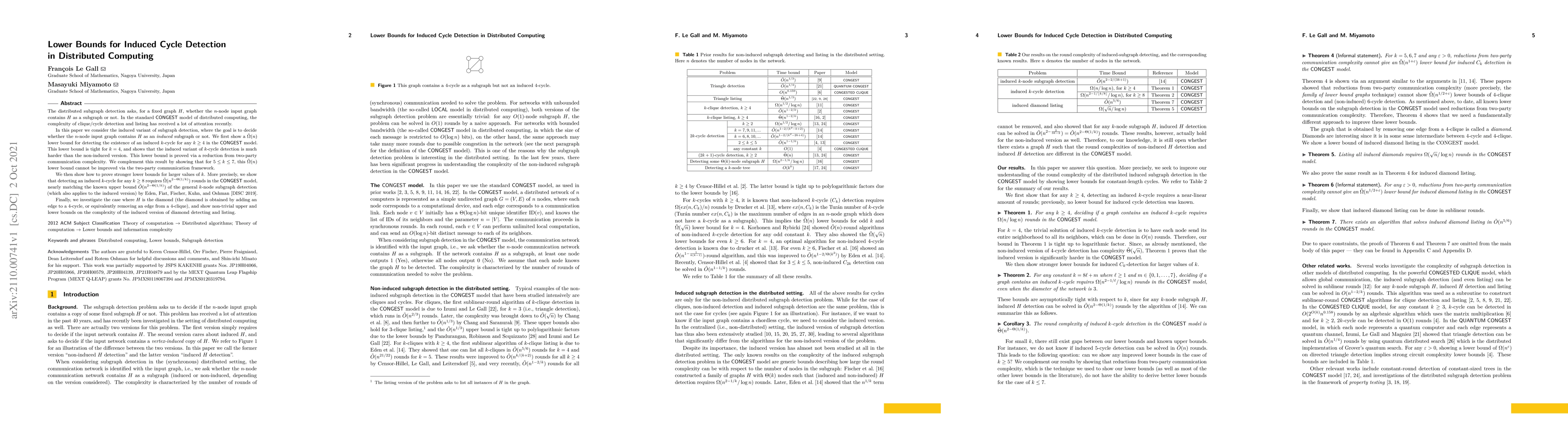 The distributed subgraph detection asks, for a fixed graph $H$, whether the $n$-node input graph contains $H$ as a subgraph or not. In the standard CONGEST model of distributed computing, the complexity of clique/cycle detection and listing has received a lot of attention recently. In this paper we consider the induced variant of subgraph detection, where the goal is to decide whether the $n$-node input graph contains $H$ as an \emph{induced} subgraph or not. We first show a $\tilde{\Omega}(n)$ lower bound for detecting the existence of an induced $k$-cycle for any $k\geq 4$ in the CONGEST model. This lower bound is tight for $k=4$, and shows that the induced variant of $k$-cycle detection is much harder than the non-induced version. This lower bound is proved via a reduction from two-party communication complexity. We complement this result by showing that for $5\leq k\leq 7$, this $\tilde{\Omega}(n)$ lower bound cannot be improved via the two-party communication framework. We then show how to prove stronger lower bounds for larger values of $k$. More precisely, we show that detecting an induced $k$-cycle for any $k\geq 8$ requires $\tilde{\Omega}(n^{2-\Theta{(1/k)}})$ rounds in the CONGEST model, nearly matching the known upper bound $\tilde{O}(n^{2-\Theta{(1/k)}})$ of the general $k$-node subgraph detection (which also applies to the induced version) by Eden, Fiat, Fischer, Kuhn, and Oshman~[DISC 2019]. Finally, we investigate the case where $H$ is the diamond (the diamond is obtained by adding an edge to a 4-cycle, or equivalently removing an edge from a 4-clique), and show non-trivial upper and lower bounds on the complexity of the induced version of diamond detecting and listing.