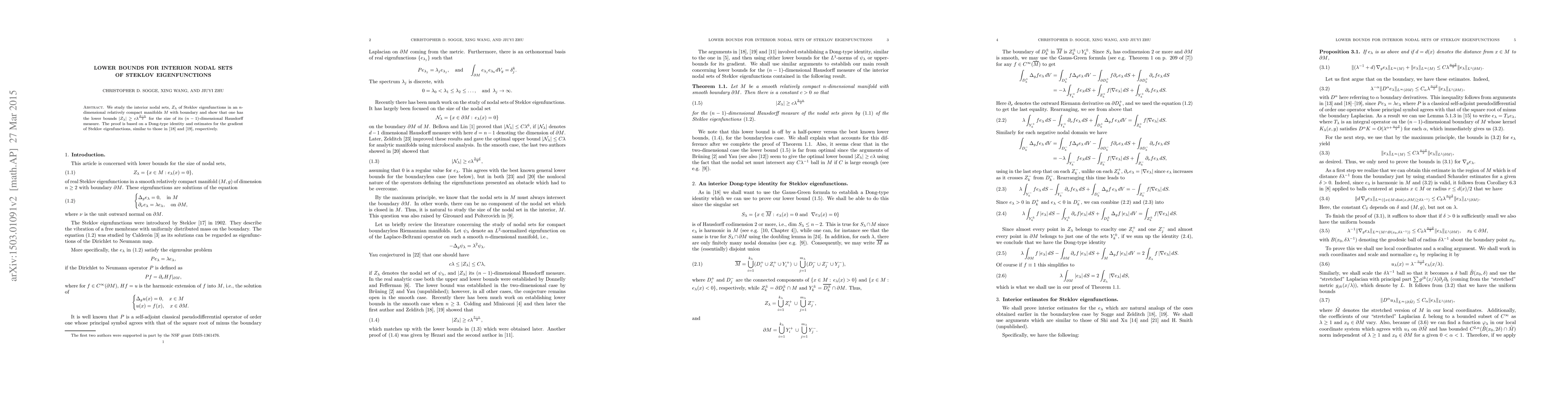 The paper introduces an interior Dong-type identity for Steklov eigenfunctions and uses it to prove lower bounds for the Hausdorff measure of their nodal sets in manifolds with boundaries.