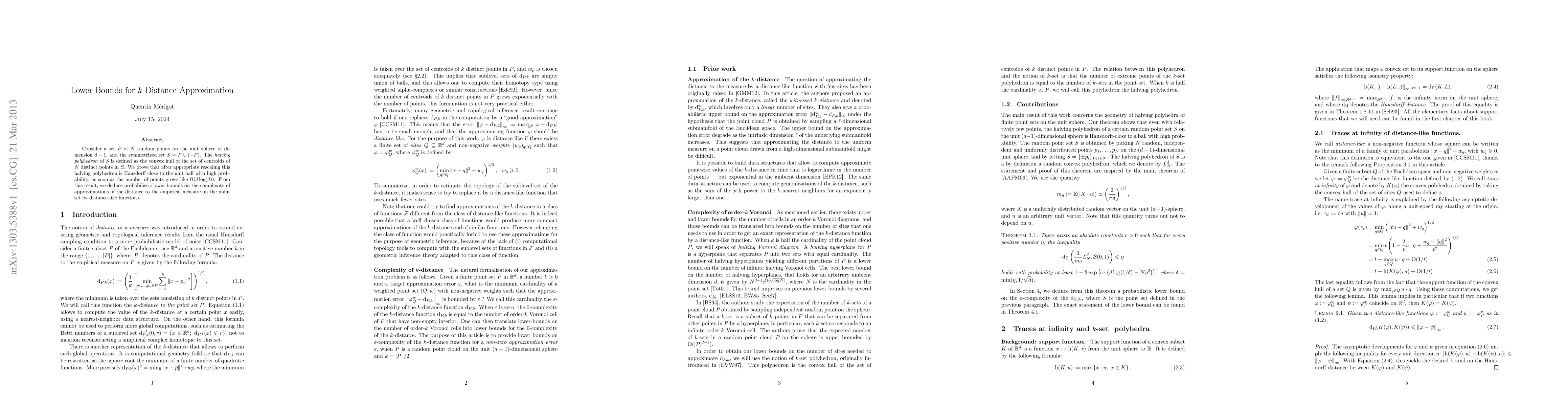Consider a set P of N random points on the unit sphere of dimension $d-1$, and the symmetrized set S = P union (-P). The halving polyhedron of S is defined as the convex hull of the set of centroids of N distinct points in S. We prove that after appropriate rescaling this halving polyhedron is Hausdorff close to the unit ball with high probability, as soon as the number of points grows like $Omega(d log(d))$. From this result, we deduce probabilistic lower bounds on the complexity of approximations of the distance to the empirical measure on the point set by distance-like functions.