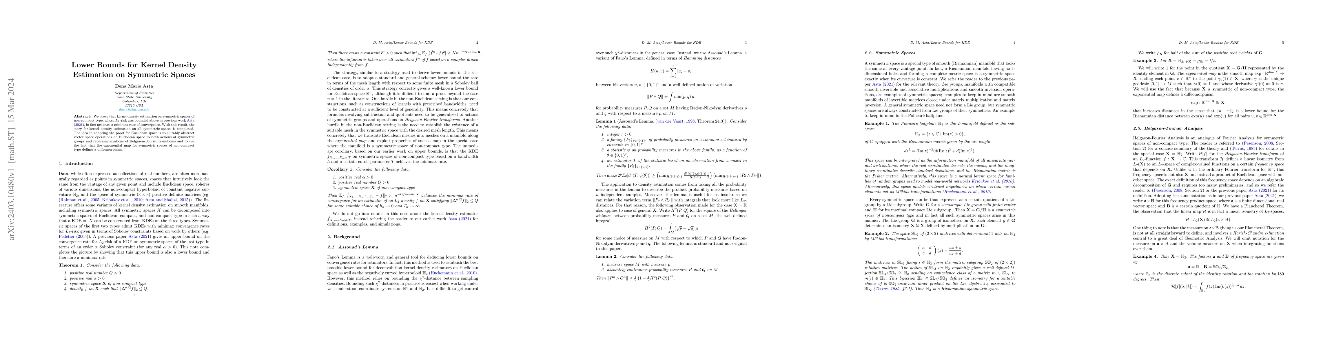 This paper establishes lower bounds for kernel density estimation on symmetric spaces of non-compact type, showing they achieve a minimax rate of convergence. The proof adapts techniques from Euclidean space to symmetric spaces by generalizing vector operations and leveraging the diffeomorphism property of the exponential map.