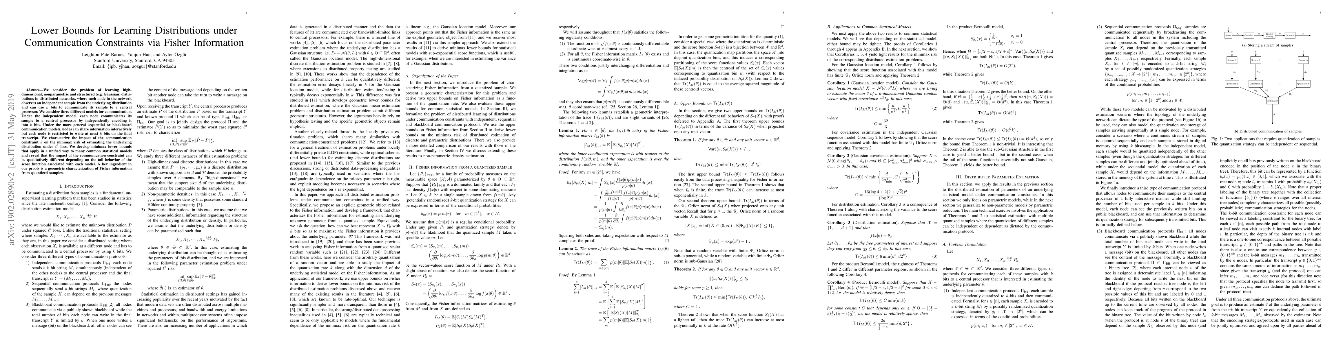 We consider the problem of learning high-dimensional, nonparametric and structured (e.g. Gaussian) distributions in distributed networks, where each node in the network observes an independent sample from the underlying distribution and can use $k$ bits to communicate its sample to a central processor. We consider three different models for communication. Under the independent model, each node communicates its sample to a central processor by independently encoding it into $k$ bits. Under the more general sequential or blackboard communication models, nodes can share information interactively but each node is restricted to write at most $k$ bits on the final transcript. We characterize the impact of the communication constraint $k$ on the minimax risk of estimating the underlying distribution under $\ell^2$ loss. We develop minimax lower bounds that apply in a unified way to many common statistical models and reveal that the impact of the communication constraint can be qualitatively different depending on the tail behavior of the score function associated with each model. A key ingredient in our proofs is a geometric characterization of Fisher information from quantized samples.