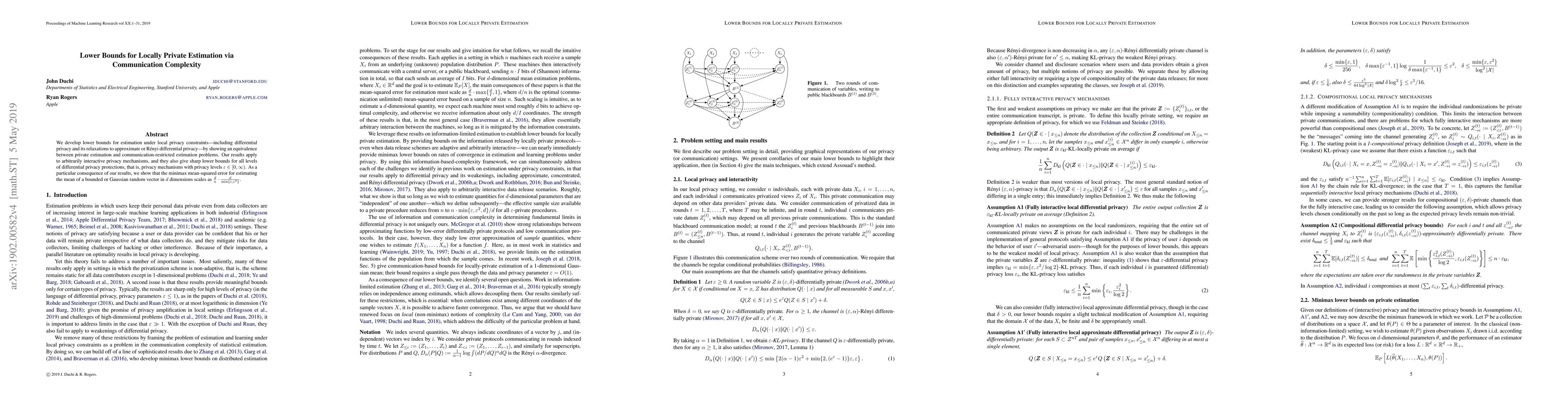 We develop lower bounds for estimation under local privacy constraints---including differential privacy and its relaxations to approximate or R\'{e}nyi differential privacy---by showing an equivalence between private estimation and communication-restricted estimation problems. Our results apply to arbitrarily interactive privacy mechanisms, and they also give sharp lower bounds for all levels of differential privacy protections, that is, privacy mechanisms with privacy levels $\varepsilon \in [0, \infty)$. As a particular consequence of our results, we show that the minimax mean-squared error for estimating the mean of a bounded or Gaussian random vector in $d$ dimensions scales as $\frac{d}{n} \cdot \frac{d}{ \min\{\varepsilon, \varepsilon^2\}}$.