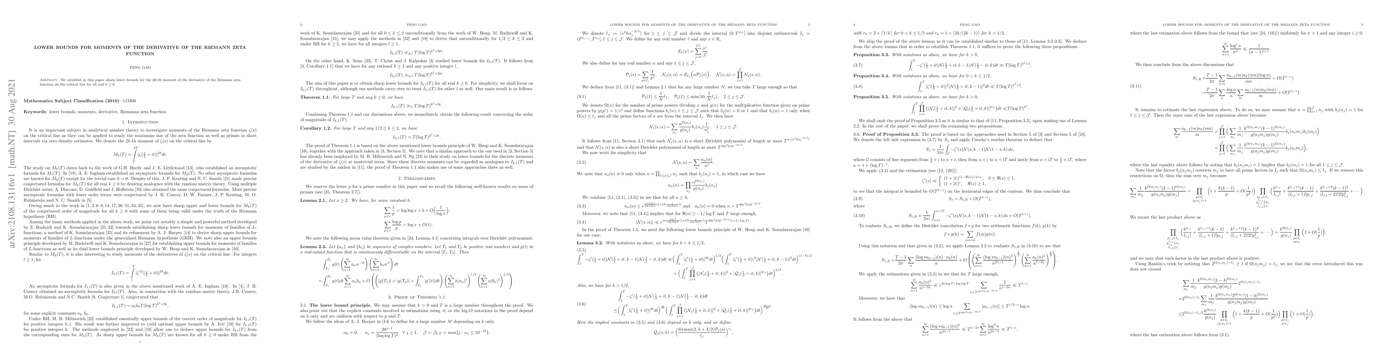 This paper establishes sharp lower bounds for moments of the Riemann zeta function's derivative on the critical line for all real k greater than or equal to 0.