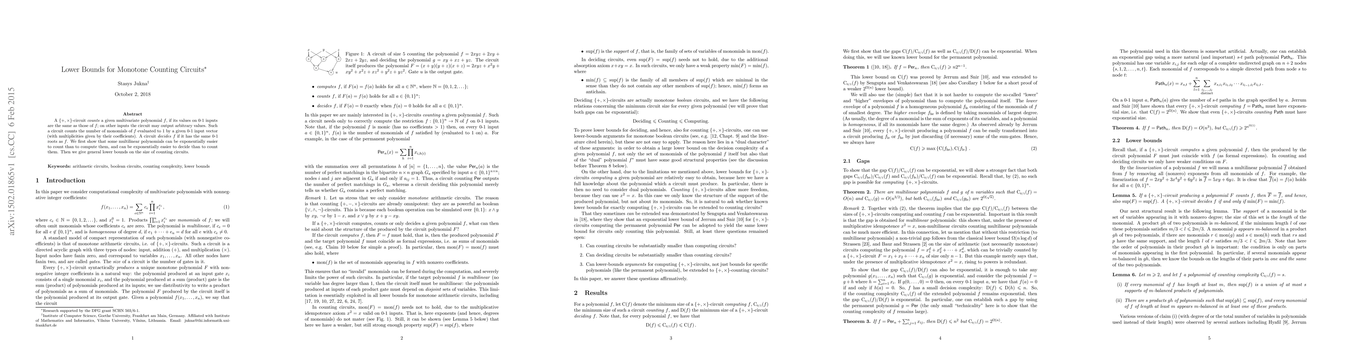 This paper establishes lower bounds for monotone counting circuits that count the number of 1s in multilinear polynomials, showing that some polynomials can be exponentially easier to count than to compute or decide. It provides general size lower bounds for such counting circuits.