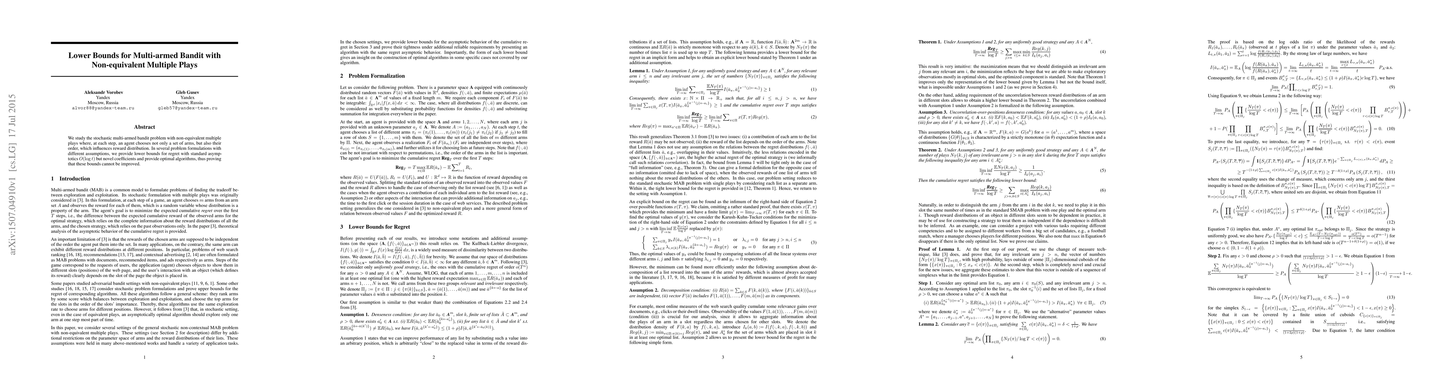We study the stochastic multi-armed bandit problem with non-equivalent multiple plays where, at each step, an agent chooses not only a set of arms, but also their order, which influences reward distribution. In several problem formulations with different assumptions, we provide lower bounds for regret with standard asymptotics $O(\log{t})$ but novel coefficients and provide optimal algorithms, thus proving that these bounds cannot be improved.