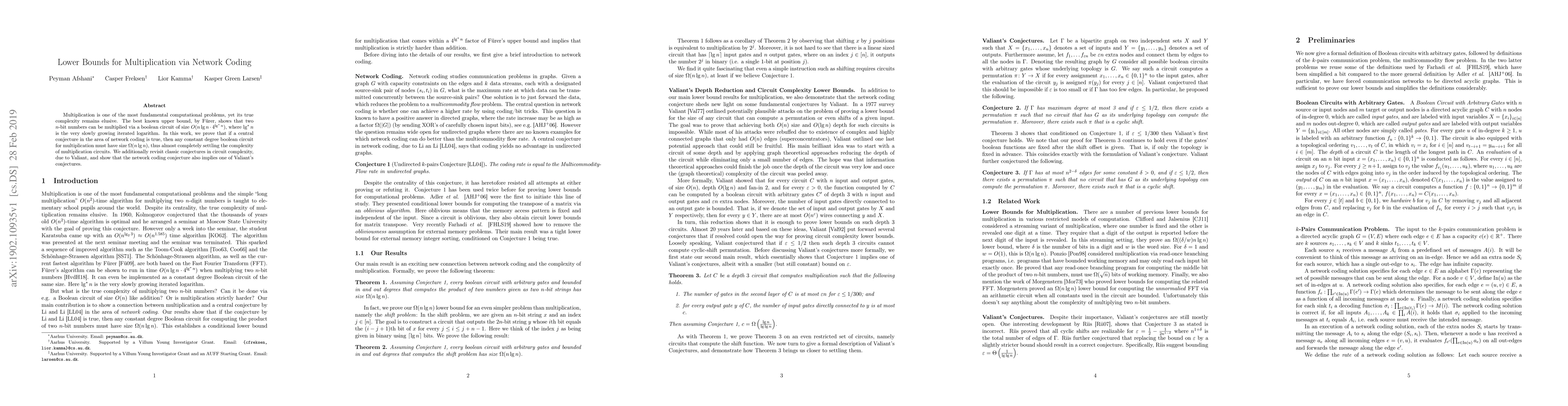 Multiplication is one of the most fundamental computational problems, yet its true complexity remains elusive. The best known upper bound, by F\"{u}rer, shows that two $n$-bit numbers can be multiplied via a boolean circuit of size $O(n \lg n \cdot 4^{\lg^*n})$, where $\lg^*n$ is the very slowly growing iterated logarithm. In this work, we prove that if a central conjecture in the area of network coding is true, then any constant degree boolean circuit for multiplication must have size $\Omega(n \lg n)$, thus almost completely settling the complexity of multiplication circuits. We additionally revisit classic conjectures in circuit complexity, due to Valiant, and show that the network coding conjecture also implies one of Valiant's conjectures.