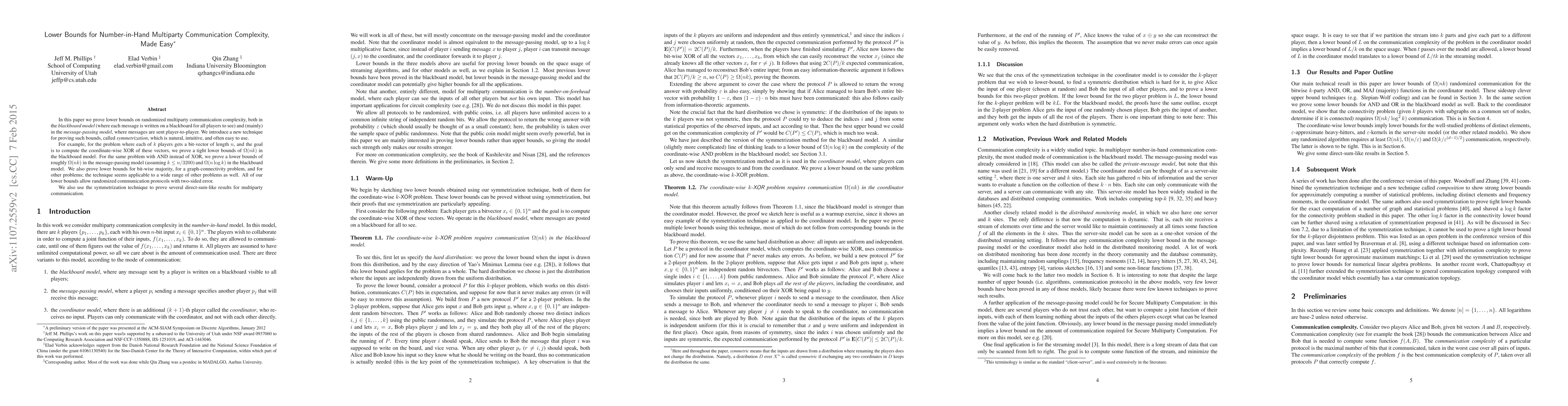This paper introduces a new technique called symmetrization to prove lower bounds on randomized multiparty communication complexity in both blackboard and message-passing models. It demonstrates tight bounds for problems like computing XOR and AND of bit-vectors, and extends to other problems, showing the technique's broad applicability.