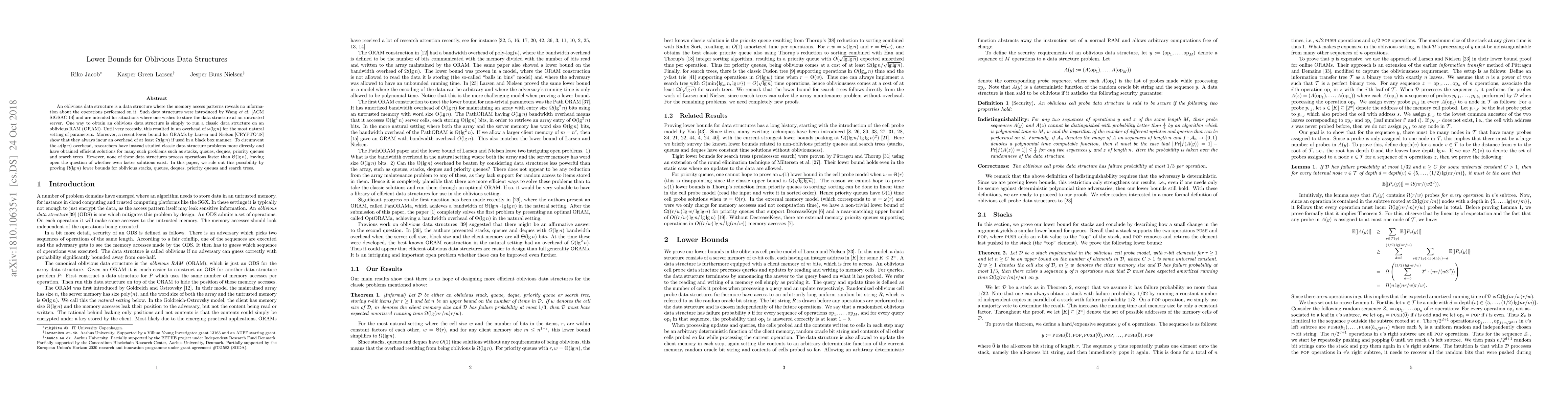 This paper establishes $\Omega(\lg n)$ lower bounds for oblivious data structures, demonstrating that no oblivious stack, queue, deque, priority queue, or search tree can operate faster than $\Theta(\lg n)$ operations, thus closing the possibility of achieving better-than-logarithmic performance for these structures.