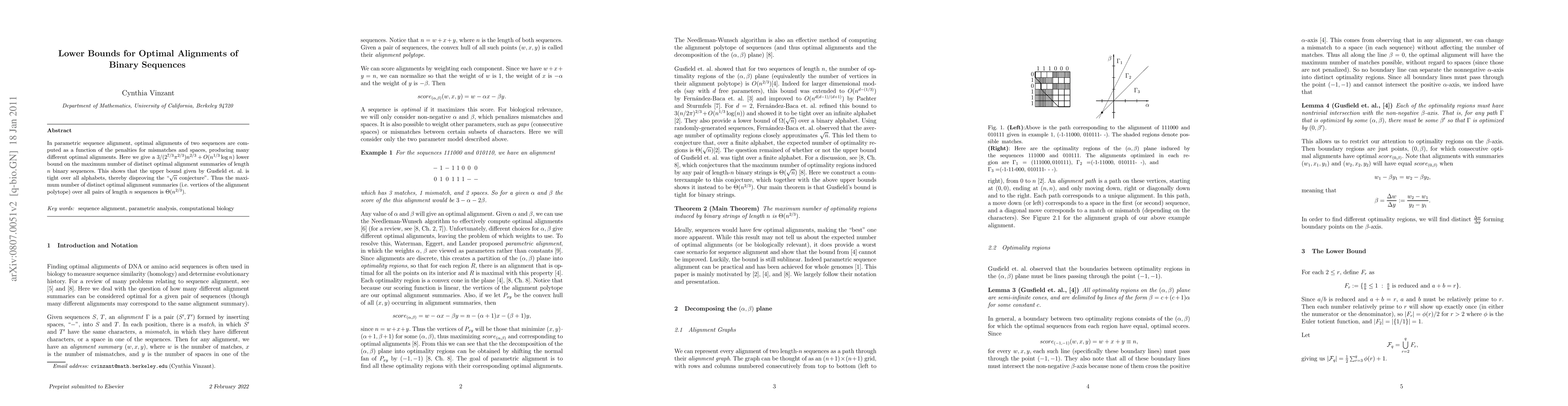 In parametric sequence alignment, optimal alignments of two sequences are computed as a function of the penalties for mismatches and spaces, producing many different optimal alignments. Here we give a 3/(2^{7/3}\pi^{2/3})n^{2/3} +O(n^{1/3} \log n) lower bound on the maximum number of distinct optimal alignment summaries of length-n binary sequences. This shows that the upper bound given by Gusfield et. al. is tight over all alphabets, thereby disproving the "square root of n conjecture". Thus the maximum number of distinct optimal alignment summaries (i.e. vertices of the alignment polytope) over all pairs of length-n sequences is Theta(n^{2/3}).