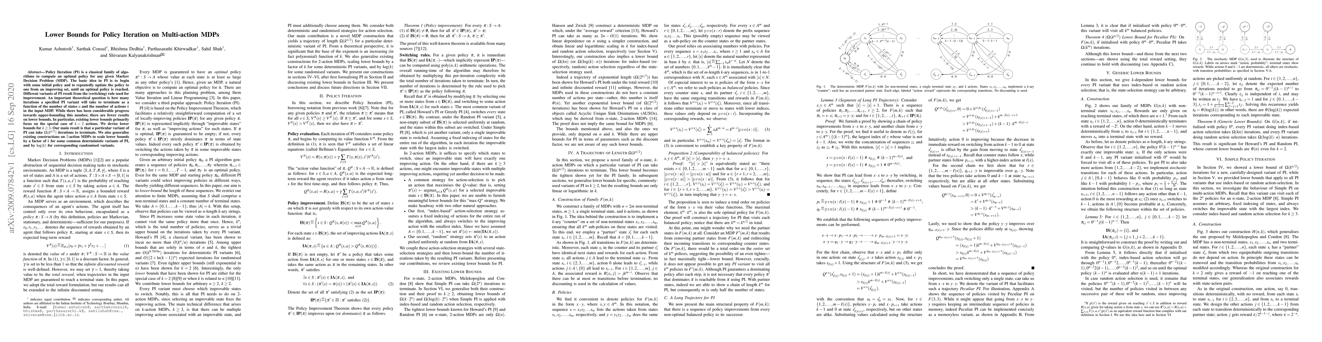 This paper establishes lower bounds for Policy Iteration algorithms on multi-action Markov Decision Processes (MDPs), showing that a particular variant can take $\Omega(k^{n/2})$ iterations to converge. The study extends existing lower bounds from two-action MDPs to $k \geq 3$ actions, scaling them by $k$ for deterministic variants and $\log(k)$ for randomised variants.