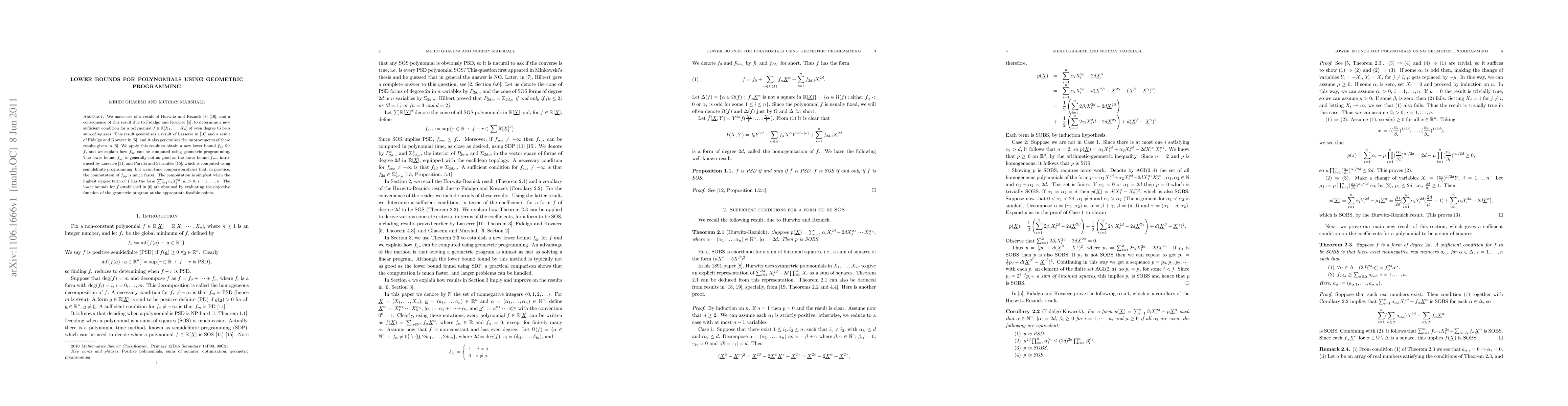 This paper establishes a new sufficient condition for polynomials to be sums of squares using geometric programming, generalizing previous results. It introduces a lower bound $f_{gp}$ that is computationally faster than the $f_{sos}$ bound from semidefinite programming, especially when the highest degree term is positive and quadratic.