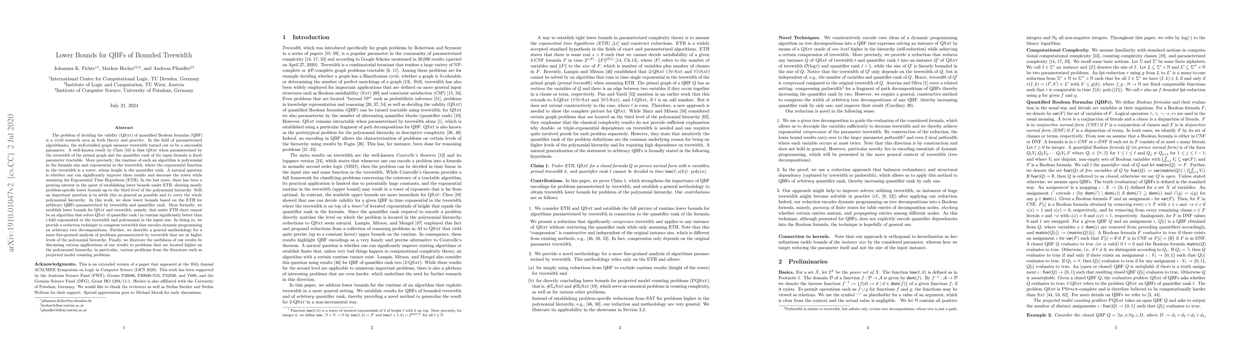 This paper establishes lower bounds for solving quantified Boolean formulas (QBF) parameterized by treewidth under the Exponential Time Hypothesis (ETH), showing that no significantly better algorithms exist than i-fold exponential in treewidth and polynomial in input size. It introduces a versatile reduction technique for compressing treewidth and proposes a methodology for fine-grained analysis of problems at higher levels of the polynomial hierarchy.