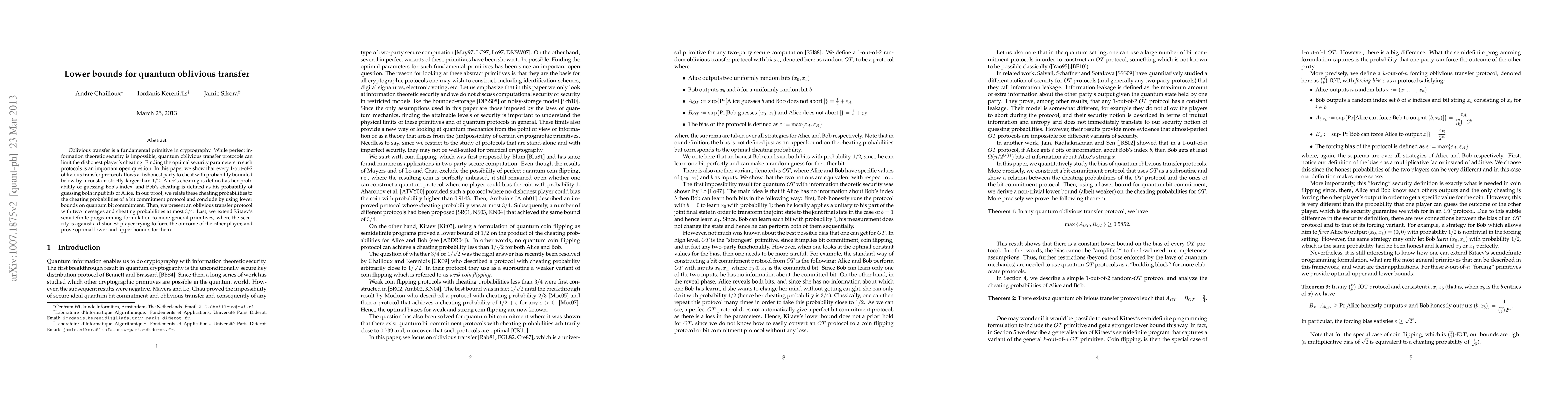 This paper presents lower bounds for quantum oblivious transfer protocols, showing that any 1-out-of-2 protocol allows cheating with a probability strictly greater than 1/2. It also introduces a protocol with two messages and cheating probabilities limited to 3/4, and extends Kitaev's semidefinite programming to prove optimal bounds for more general primitives.
