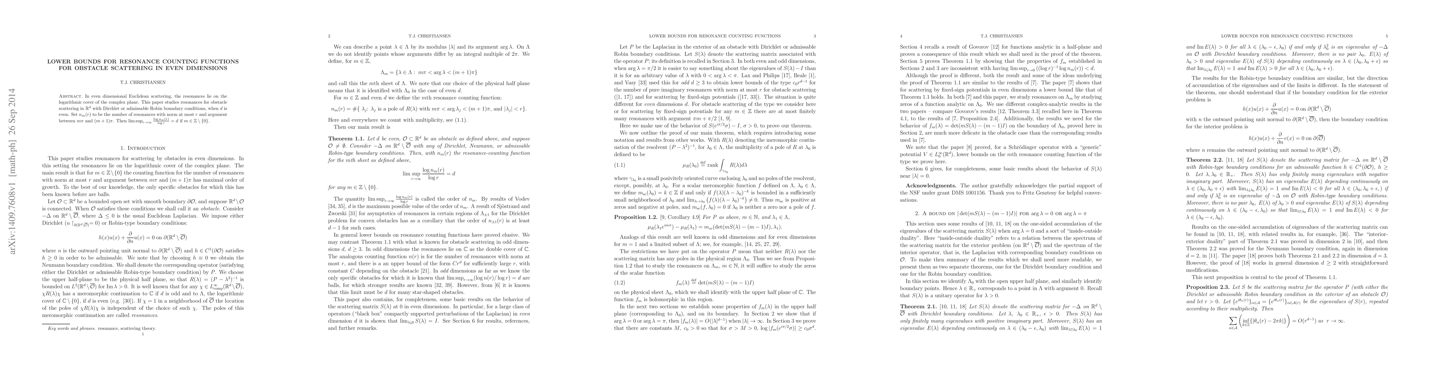 In even dimensional Euclidean scattering, the resonances lie on the logarithmic cover of the complex plane. This paper studies resonances for obstacle scattering in ${\mathbb R}^d$ with Dirchlet or admissable Robin boundary conditions, when $d$ is even. Set $n_m(r)$ to be the number of resonances with norm at most $r$ and argument between $m\pi$ and $(m+1)\pi$. Then $\lim\sup _{r\rightarrow \infty}\frac{\log n_m(r)}{\log r}=d$ if $m\in {\mathbb Z}\setminus \{ 0\}$.