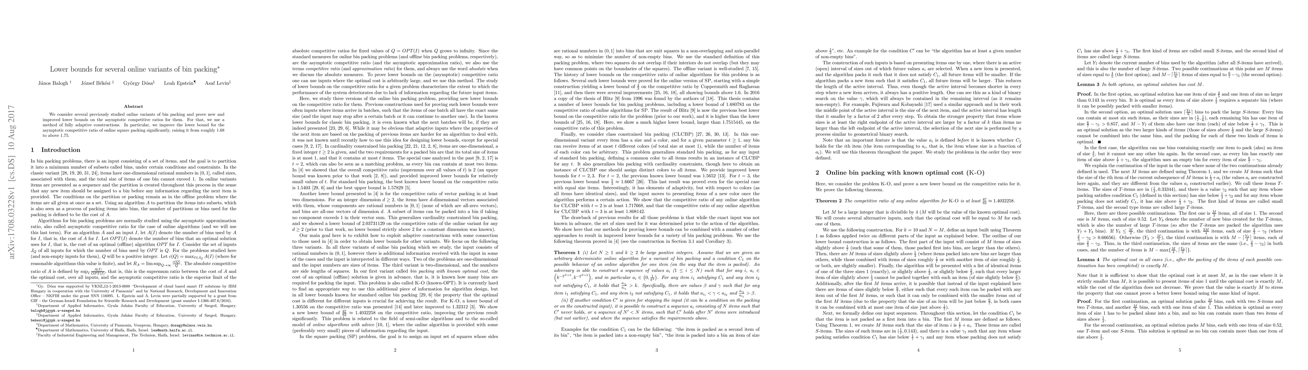 We consider several previously studied online variants of bin packing and prove new and improved lower bounds on the asymptotic competitive ratios for them. For that, we use a method of fully adaptive constructions. In particular, we improve the lower bound for the asymptotic competitive ratio of online square packing significantly, raising it from roughly 1.68 to above 1.75.