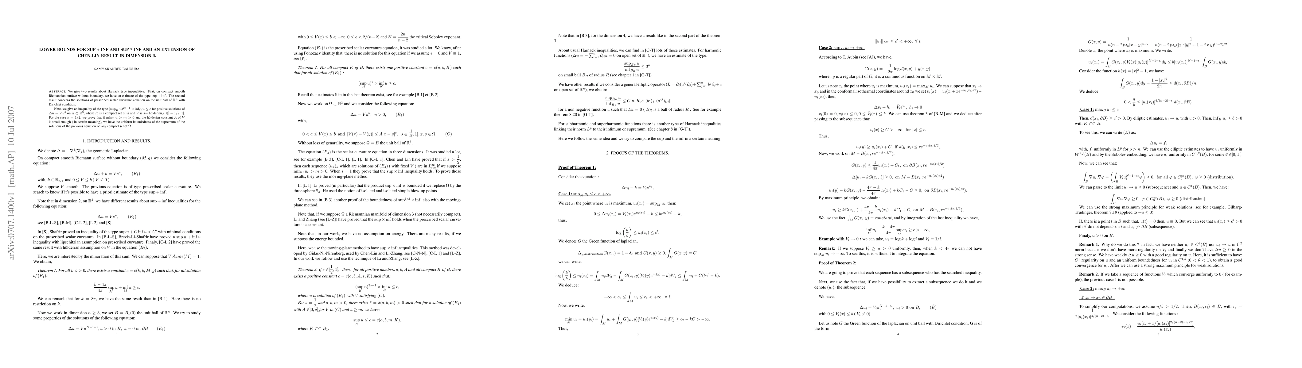 We give two results about Harnack type inequalities. First, on compact smooth Riemannian surface without boundary, we have an estimate of the type $\sup +\inf$. The second result concerns the solutions of prescribed scalar curvature equation on the unit ball of ${\mathbb R}^n$ with Dirichlet condition. Next, we give an inequality of the type $(\sup_K u)^{2s-1} \times \inf_{\Omega} u \leq c$ for positive solutions of $\Delta u=Vu^5$ on $\Omega \subset {\mathbb R}^3$, where $K$ is a compact set of $\Omega$ and $V$ is $s-$ h\"olderian, $s\in ]-1/2,1]$. For the case $s=1/2$, we prove that if $\min_{\Omega} u>m>0$ and the h\"olderian constant $A$ of $V$ is small enough (in certain meaning), we have the uniform boundedness of the supremum of the solutions of the previous equation on any compact set of $\Omega$. ----- Nous donnons quelques estimations des solutions d'equations elliptiques sur les surfaces de Riemann et sur des ouverts en dimension n> 2. Nous traitons le cas holderien pour l'equation de la courbure scalaire prescrite en dimension 3.