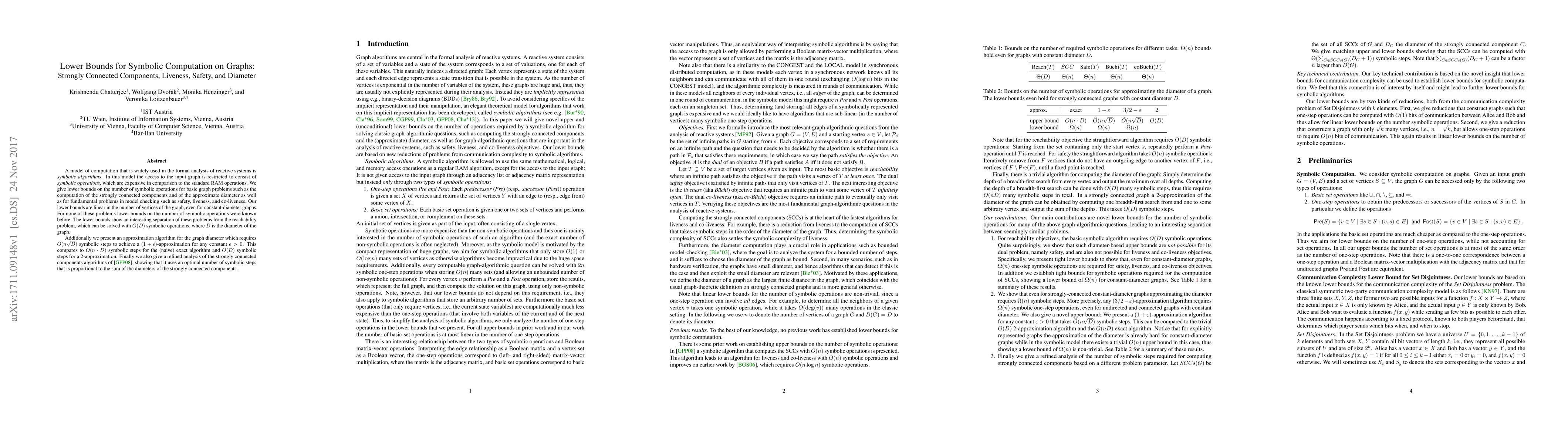 A model of computation that is widely used in the formal analysis of reactive systems is symbolic algorithms. In this model the access to the input graph is restricted to consist of symbolic operations, which are expensive in comparison to the standard RAM operations. We give lower bounds on the number of symbolic operations for basic graph problems such as the computation of the strongly connected components and of the approximate diameter as well as for fundamental problems in model checking such as safety, liveness, and co-liveness. Our lower bounds are linear in the number of vertices of the graph, even for constant-diameter graphs. For none of these problems lower bounds on the number of symbolic operations were known before. The lower bounds show an interesting separation of these problems from the reachability problem, which can be solved with $O(D)$ symbolic operations, where $D$ is the diameter of the graph. Additionally we present an approximation algorithm for the graph diameter which requires $\tilde{O}(n \sqrt{D})$ symbolic steps to achieve a $(1+\epsilon)$-approximation for any constant $\epsilon > 0$. This compares to $O(n \cdot D)$ symbolic steps for the (naive) exact algorithm and $O(D)$ symbolic steps for a 2-approximation. Finally we also give a refined analysis of the strongly connected components algorithms of Gentilini et al., showing that it uses an optimal number of symbolic steps that is proportional to the sum of the diameters of the strongly connected components.