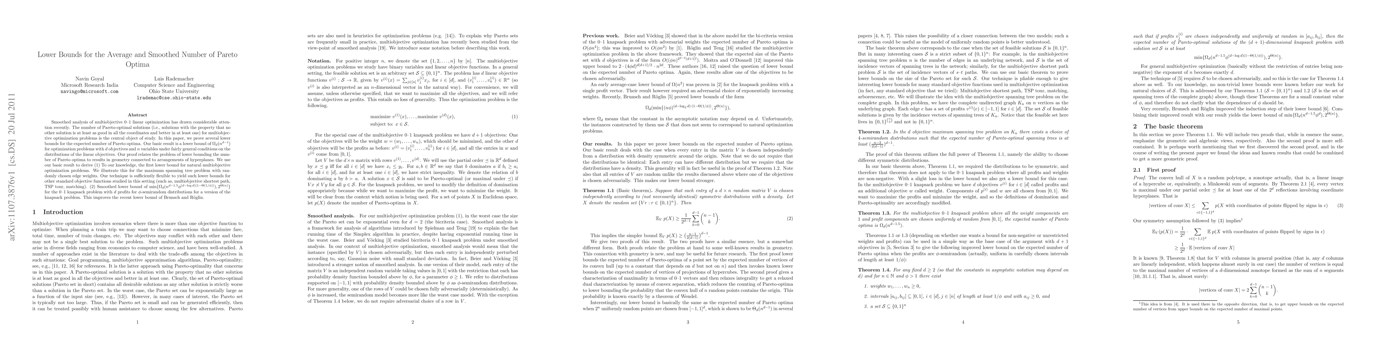 Smoothed analysis of multiobjective 0-1 linear optimization has drawn considerable attention recently. The number of Pareto-optimal solutions (i.e., solutions with the property that no other solution is at least as good in all the coordinates and better in at least one) for multiobjective optimization problems is the central object of study. In this paper, we prove several lower bounds for the expected number of Pareto optima. Our basic result is a lower bound of \Omega_d(n^(d-1)) for optimization problems with d objectives and n variables under fairly general conditions on the distributions of the linear objectives. Our proof relates the problem of lower bounding the number of Pareto optima to results in geometry connected to arrangements of hyperplanes. We use our basic result to derive (1) To our knowledge, the first lower bound for natural multiobjective optimization problems. We illustrate this for the maximum spanning tree problem with randomly chosen edge weights. Our technique is sufficiently flexible to yield such lower bounds for other standard objective functions studied in this setting (such as, multiobjective shortest path, TSP tour, matching). (2) Smoothed lower bound of min {\Omega_d(n^(d-1.5) \phi^{(d-log d) (1-\Theta(1/\phi))}), 2^{\Theta(n)}}$ for the 0-1 knapsack problem with d profits for phi-semirandom distributions for a version of the knapsack problem. This improves the recent lower bound of Brunsch and Roeglin.