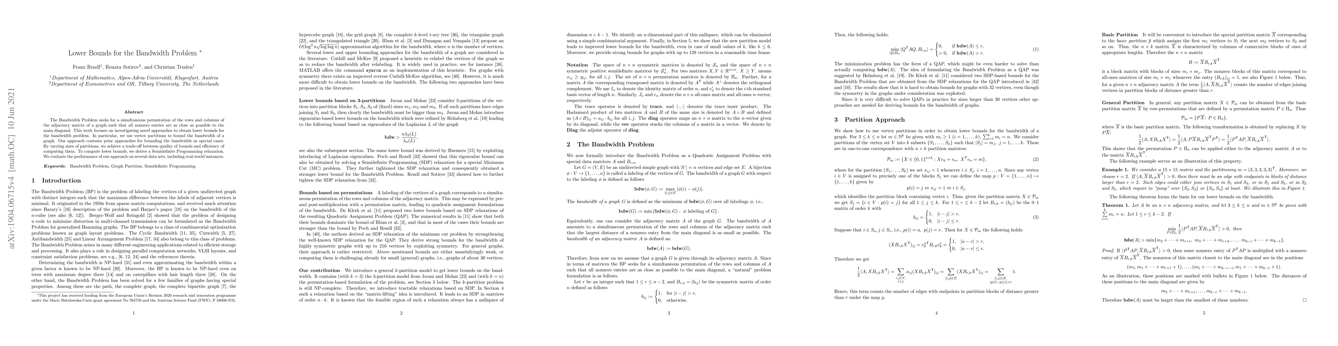 The Bandwidth Problem seeks for a simultaneous permutation of the rows and columns of the adjacency matrix of a graph such that all nonzero entries are as close as possible to the main diagonal. This work focuses on investigating novel approaches to obtain lower bounds for the bandwidth problem. In particular, we use vertex partitions to bound the bandwidth of a graph. Our approach contains prior approaches for bounding the bandwidth as special cases. By varying sizes of partitions, we achieve a trade-off between quality of bounds and efficiency of computing them. To compute lower bounds, we derive a Semidefinite Programming relaxation. We evaluate the performance of our approach on several data sets, including real-world instances.