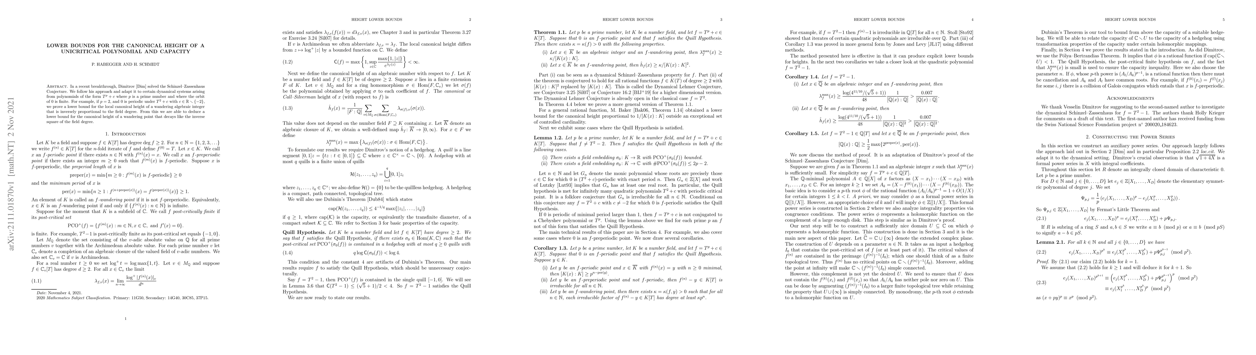 In a recent breakthrough, Dimitrov solved the Schinzel-Zassenhaus Conjecture. We follow his approach and adapt it to certain dynamical systems arising from polynomials of the form $T^p+c$ where $p$ is a prime number and where the orbit of $0$ is finite. For example, if $p=2$, and $0$ is periodic under $T^2+c$ with $c\in\mathbb{R}\smallsetminus\{-2\}$, we prove a lower bound for the local canonical height of a wandering algebraic integer that is inversely proportional to the field degree. From this we are able to deduce a lower bound for the canonical height of a wandering point that decays like the inverse square of the field degree.