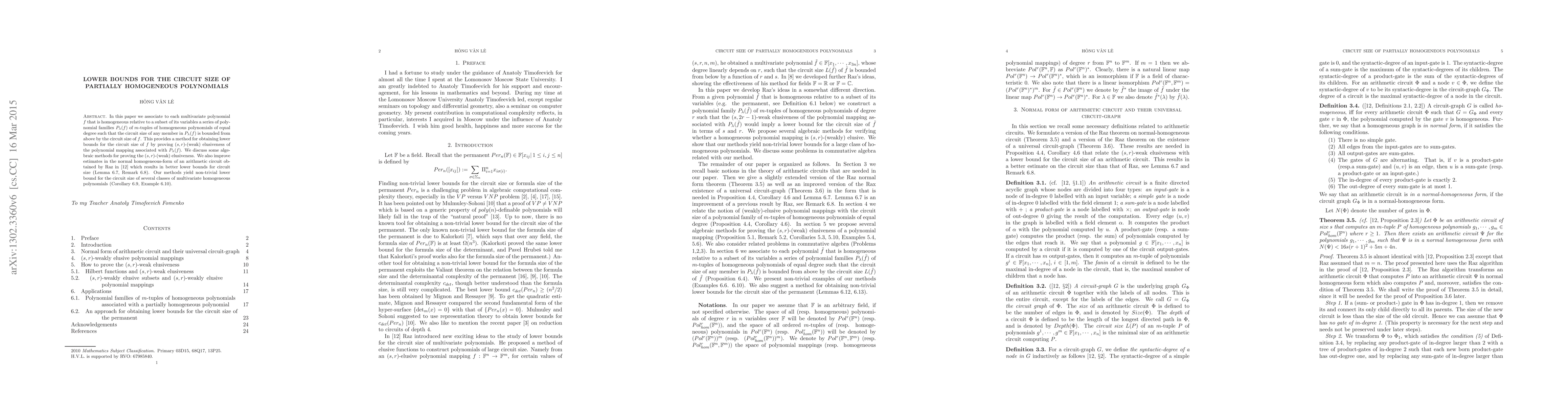 In this paper we associate to each multivariate polynomial $f$ that is homogeneous relative to a subset of its variables a series of polynomial families $P_\lambda (f)$ of $m$-tuples of homogeneous polynomials of equal degree such that the circuit size of any member in $P_\lambda (f)$ is bounded from above by the circuit size of $f$. This provides a method for obtaining lower bounds for the circuit size of $f$ by proving $(s,r)$-(weak) elusiveness of the polynomial mapping associated with $P_\lambda (f)$. We discuss some algebraic methods for proving the $(s,r)$-(weak) elusiveness. We also improve estimates in the normal homogeneous-form of an arithmetic circuit obtained by Raz in \cite{Raz2009} which results in better lower bounds for circuit size (Lemma \ref{lem:cor38}, Remark \ref{rem:cor38}). Our methods yield non-trivial lower bound for the circuit size of several classes of multivariate homogeneous polynomials (Corollary \ref{cor:412}, Example \ref{ex:bi}).