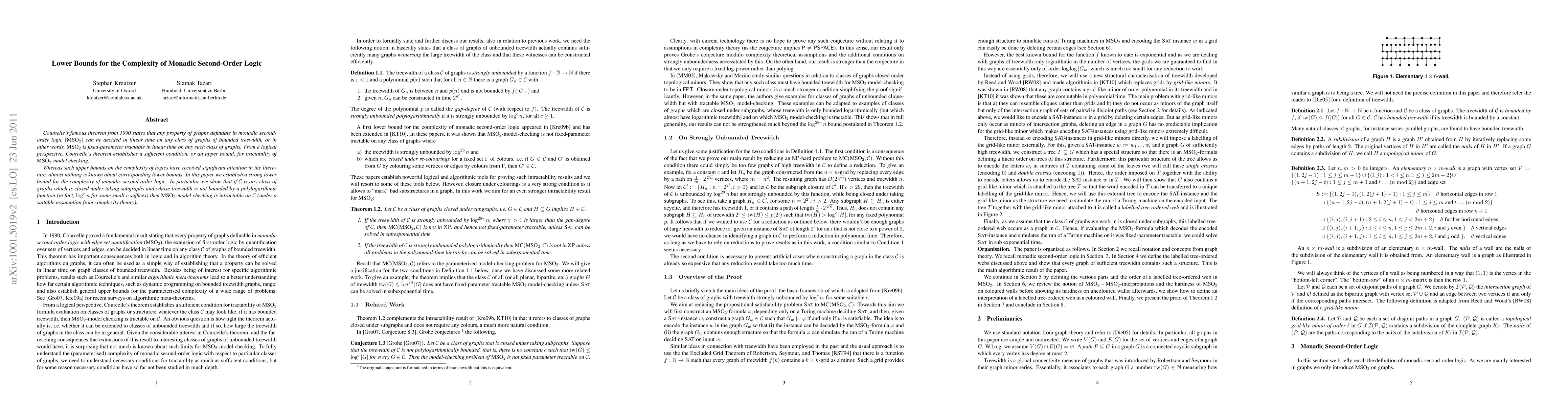 This paper establishes a strong lower bound for the complexity of monadic second-order logic (MSO), showing that MSO-model checking is intractable on any class of graphs closed under subgraphs, unless the treewidth of the class is bounded by a polylogarithmic function. This contrasts with the upper bound provided by Courcelle's theorem, which shows MSO's tractability on graphs of bounded treewidth.