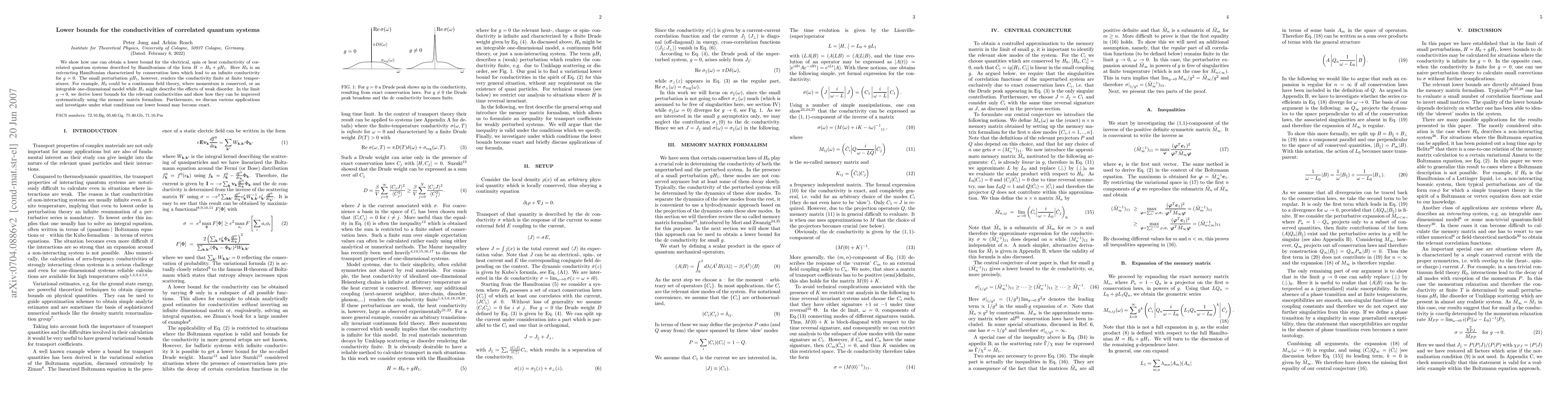 We show how one can obtain a lower bound for the electrical, spin or heat conductivity of correlated quantum systems described by Hamiltonians of the form H = H0 + g H1. Here H0 is an interacting Hamiltonian characterized by conservation laws which lead to an infinite conductivity for g=0. The small perturbation g H1, however, renders the conductivity finite at finite temperatures. For example, H0 could be a continuum field theory, where momentum is conserved, or an integrable one-dimensional model while H1 might describe the effects of weak disorder. In the limit g to 0, we derive lower bounds for the relevant conductivities and show how they can be improved systematically using the memory matrix formalism. Furthermore, we discuss various applications and investigate under what conditions our lower bound may become exact.