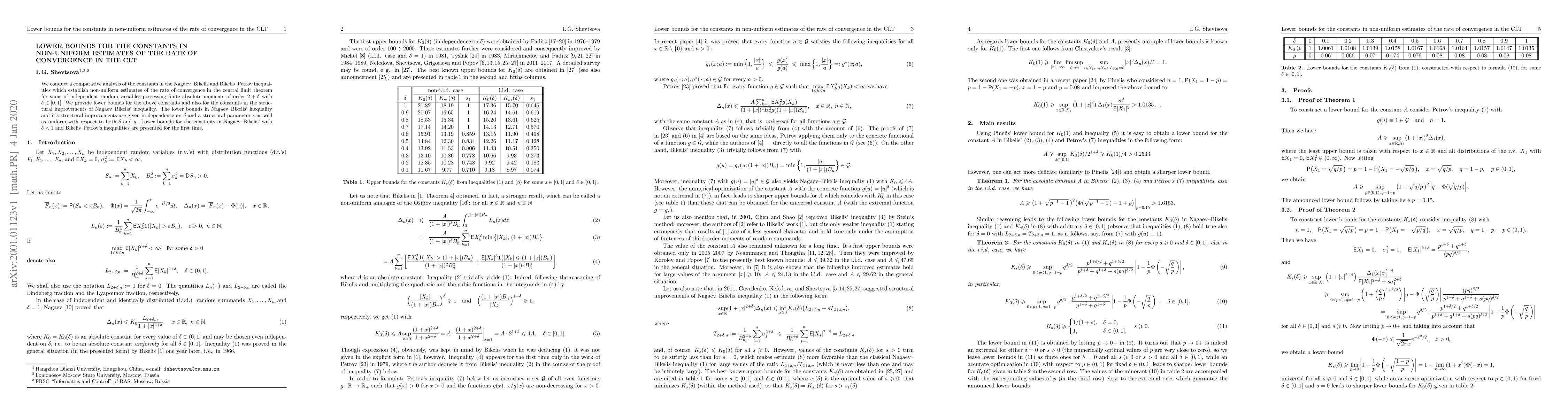 We conduct a comparative analysis of the constants in the Nagaev-Bikelis and Bikelis-Petrov inequalities which establish non-uniform estimates of the rate of convergence in the central limit theorem for sums of independent random variables possessing finite absolute moments of order $2+\delta$ with $\delta\in[0,1]$. We provide lower bounds for the above constants and also for the constants in the structural improvements of Nagaev-Bikelis' inequality. The lower bounds in Nagaev-Bikelis' inequality and it's structural improvements are given in dependence on $\delta$ and a structural parameter $s$ as well as uniform with respect to both $\delta$ and $s$. Lower bounds for the constants in Nagaev-Bikelis' with $\delta<1$ and Bikelis-Petrov's inequalities are presented for the first time.