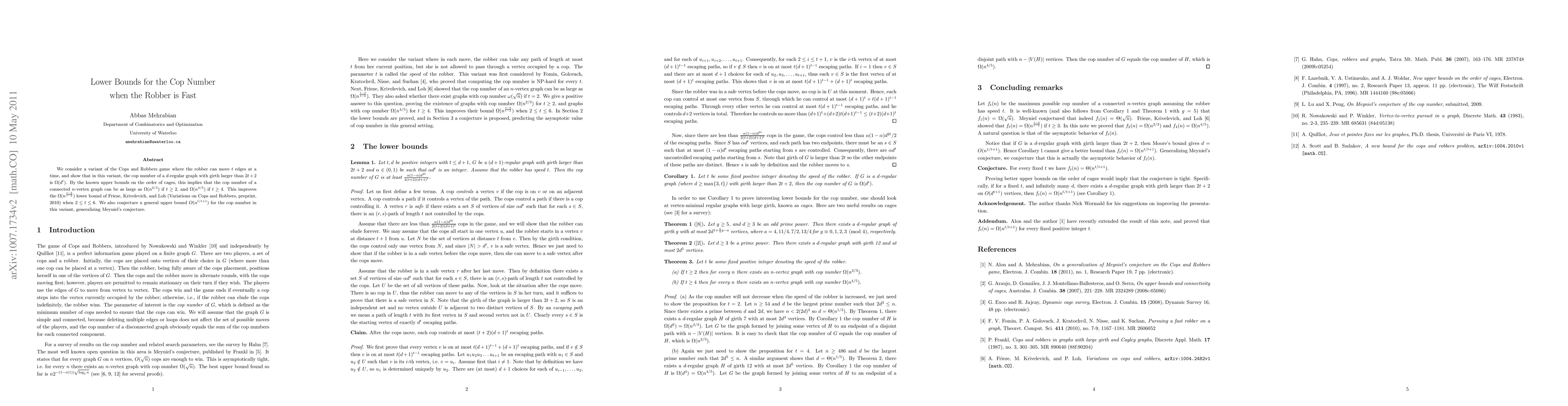 This paper establishes a new Omega(d^t) lower bound for the cop number in a variant of the Cops and Robbers game where the robber can move t edges at a time, improving previous results. It also suggests that the cop number can be as large as Omega(n^{2/3}) for t>1 and Omega(n^{4/5}) for t>3.