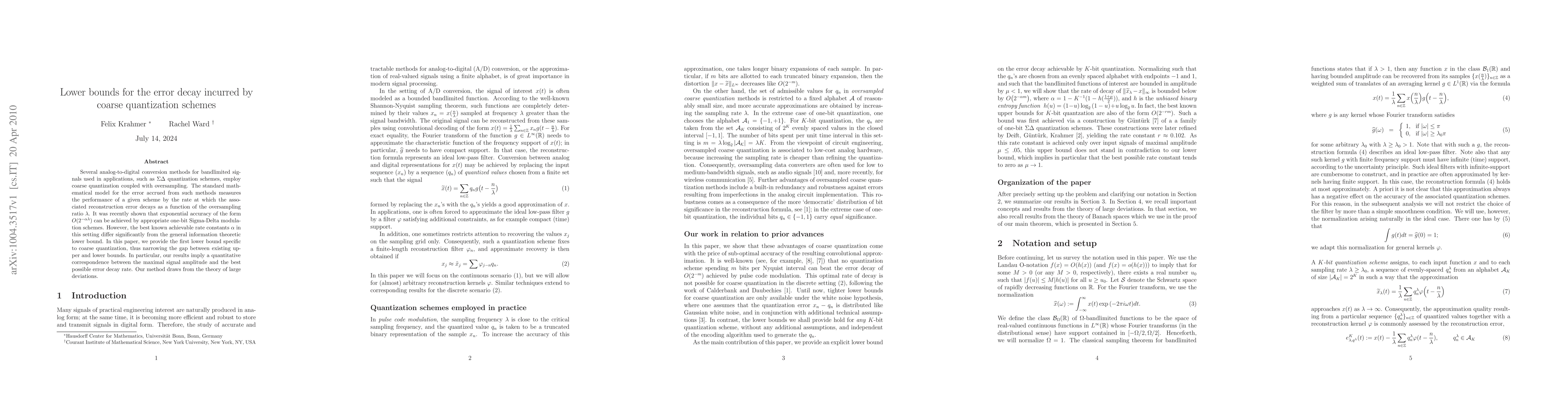 This paper establishes the first lower bound for the error decay rate in coarse quantization schemes, specifically addressing Sigma Delta quantization. It narrows the gap between existing upper and lower bounds by providing a quantitative relationship between maximal signal amplitude and optimal error decay rate, utilizing large deviations theory.