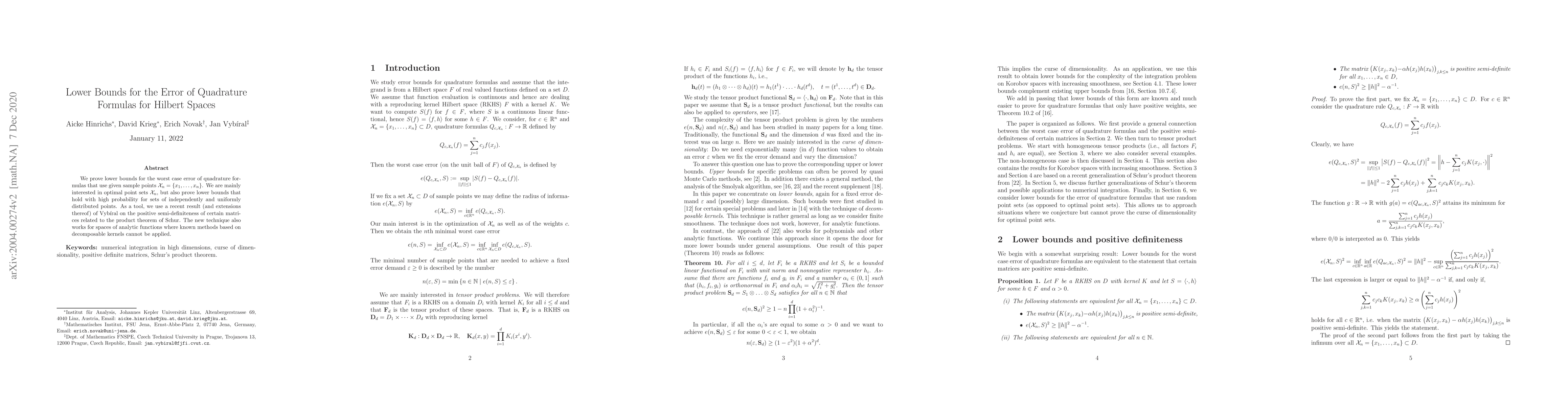 This paper establishes lower bounds for the worst-case error of quadrature formulas in Hilbert spaces, focusing on optimal point sets and high-probability bounds for uniformly distributed points. It employs Vybíral's results on positive semi-definiteness of matrices related to the Schur product theorem, extending applicability to analytic function spaces.