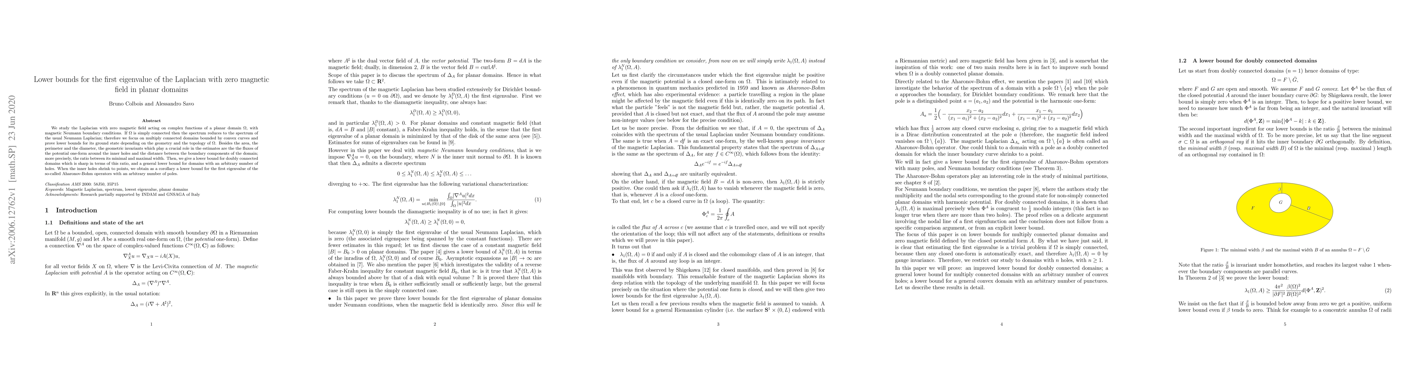 This paper investigates lower bounds for the first eigenvalue of the Laplacian in multiply connected planar domains with zero magnetic field, focusing on the geometry and topology of the domain. It provides sharp and general lower bounds based on geometric invariants, including the ratio of minimal to maximal width, and extends results to Aharonov-Bohm operators.