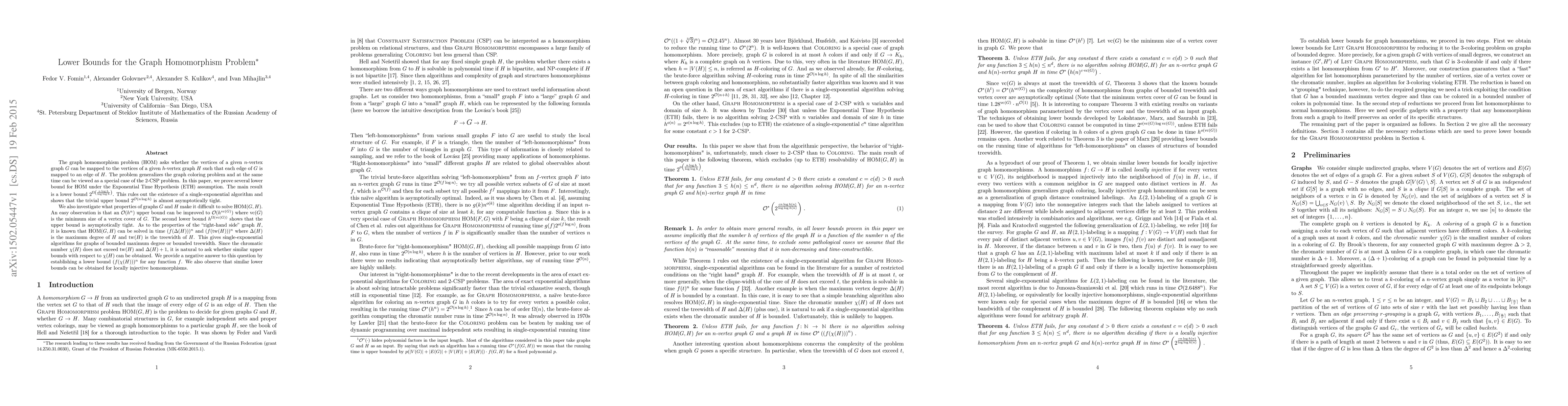 The graph homomorphism problem (HOM) asks whether the vertices of a given $n$-vertex graph $G$ can be mapped to the vertices of a given $h$-vertex graph $H$ such that each edge of $G$ is mapped to an edge of $H$. The problem generalizes the graph coloring problem and at the same time can be viewed as a special case of the $2$-CSP problem. In this paper, we prove several lower bound for HOM under the Exponential Time Hypothesis (ETH) assumption. The main result is a lower bound $2^{\Omega\left( \frac{n \log h}{\log \log h}\right)}$. This rules out the existence of a single-exponential algorithm and shows that the trivial upper bound $2^{{\mathcal O}(n\log{h})}$ is almost asymptotically tight. We also investigate what properties of graphs $G$ and $H$ make it difficult to solve HOM$(G,H)$. An easy observation is that an ${\mathcal O}(h^n)$ upper bound can be improved to ${\mathcal O}(h^{\operatorname{vc}(G)})$ where $\operatorname{vc}(G)$ is the minimum size of a vertex cover of $G$. The second lower bound $h^{\Omega(\operatorname{vc}(G))}$ shows that the upper bound is asymptotically tight. As to the properties of the "right-hand side" graph $H$, it is known that HOM$(G,H)$ can be solved in time $(f(\Delta(H)))^n$ and $(f(\operatorname{tw}(H)))^n$ where $\Delta(H)$ is the maximum degree of $H$ and $\operatorname{tw}(H)$ is the treewidth of $H$. This gives single-exponential algorithms for graphs of bounded maximum degree or bounded treewidth. Since the chromatic number $\chi(H)$ does not exceed $\operatorname{tw}(H)$ and $\Delta(H)+1$, it is natural to ask whether similar upper bounds with respect to $\chi(H)$ can be obtained. We provide a negative answer to this question by establishing a lower bound $(f(\chi(H)))^n$ for any function $f$. We also observe that similar lower bounds can be obtained for locally injective homomorphisms.