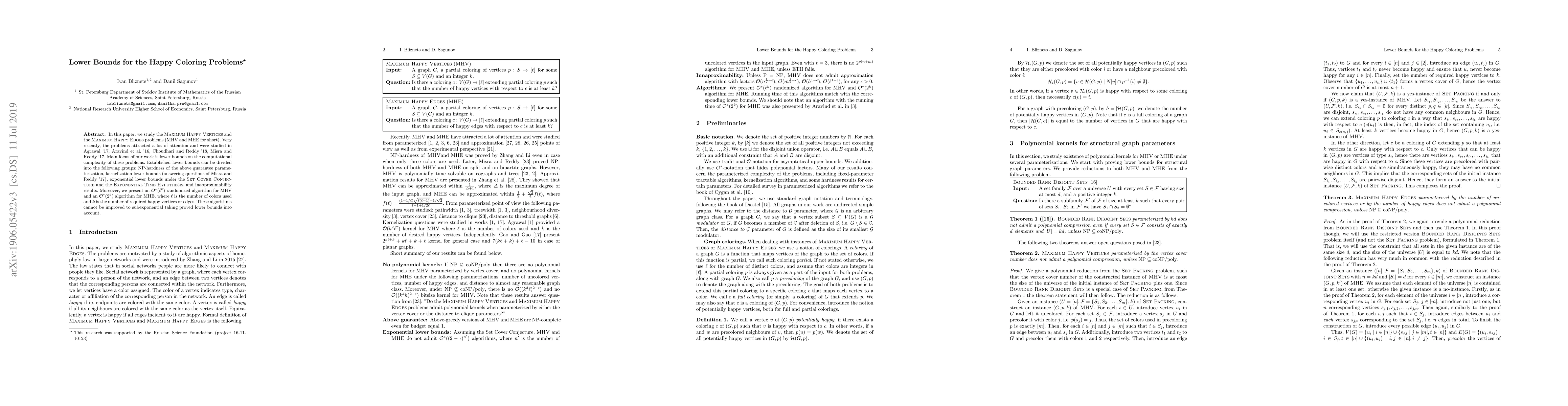 The paper studies the computational complexity of Maximum Happy Vertices (MHV) and Maximum Happy Edges (MHE) problems through various reductions and lower bounds, including NP-hardness, kernelization lower bounds, exponential lower bounds under the Set Cover Conjecture and the Exponential Time Hypothesis, and inapproximability results.