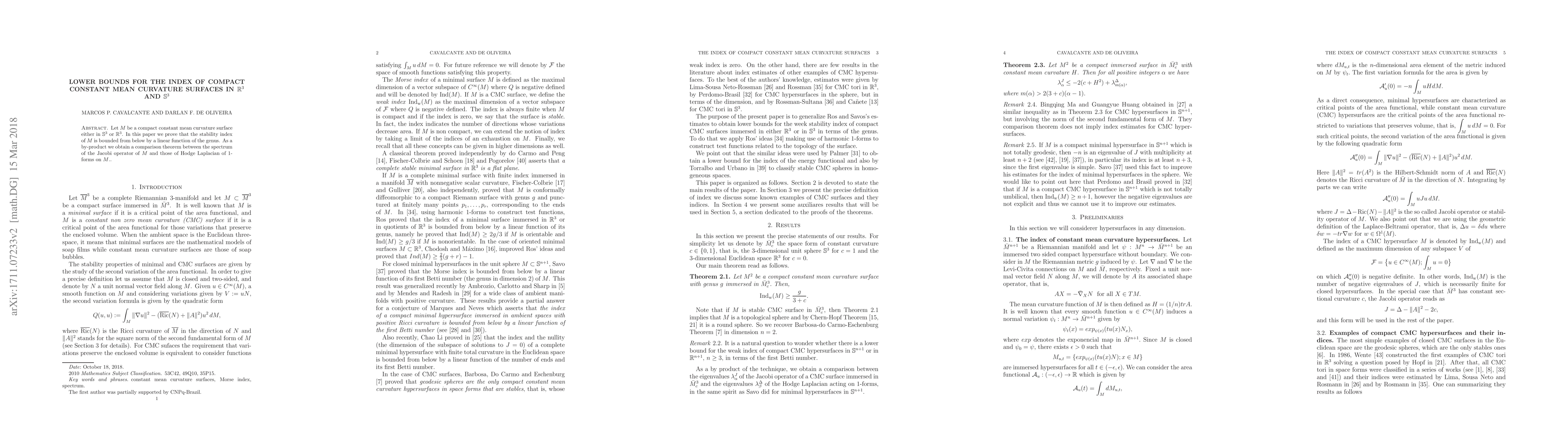 Let $M$ be a compact constant mean curvature surface either in $\mathbb{S}^3$ or $\mathbb{R}^3$. In this paper we prove that the stability index of $M$ is bounded below by a linear function of the genus. As a by product we obtain a comparison theorem between the spectrum of the Jacobi operator of $M$ and those of Hodge Laplacian of $1$-forms on $M$.