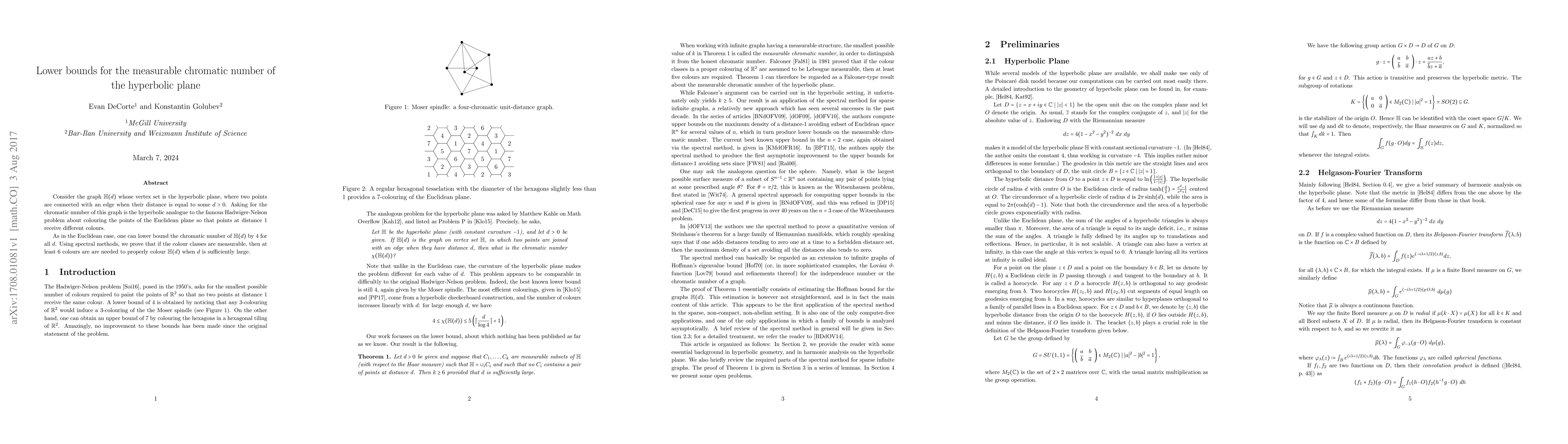 Consider the graph $\mathbb{H}(d)$ whose vertex set is the hyperbolic plane, where two points are connected with an edge when their distance is equal to some $d>0$. Asking for the chromatic number of this graph is the hyperbolic analogue to the famous Hadwiger-Nelson problem about colouring the points of the Euclidean plane so that points at distance $1$ receive different colours. As in the Euclidean case, one can lower bound the chromatic number of $\mathbb{H}(d)$ by $4$ for all $d$. Using spectral methods, we prove that if the colour classes are measurable, then at least $6$ colours are are needed to properly colour $\mathbb{H}(d)$ when $d$ is sufficiently large.