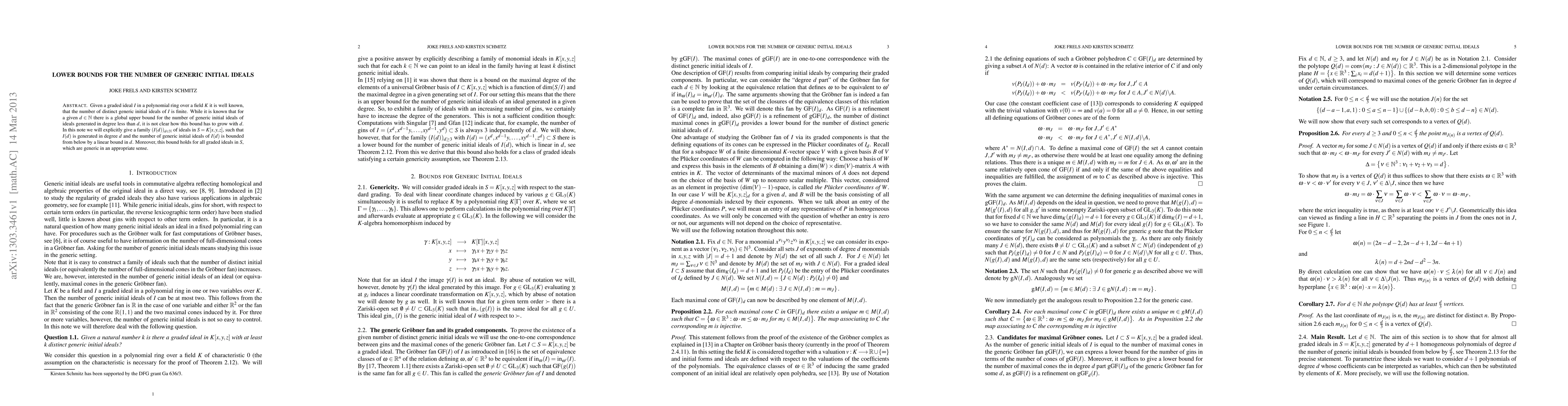 Given a graded ideal $I$ in a polynomial ring over a field $K$ it is well known, that the number of distinct generic initial ideals of $I$ is finite. While it is known that for a given $d\in\N$ there is a global upper bound for the number of generic initial ideals of ideals generated in degree less than $d$, it is not clear how this bound has to grow with $d$. In this note we will explicitly give a family $(I(d))_{d\in\N}$ of ideals in $S=K[x,y,z]$, such that $I(d)$ is generated in degree $d$ and the number of generic initial ideals of $I(d)$ is bounded from below by a linear bound in $d$. Moreover, this bound holds for all graded ideals in $S$, which are generic in an appropriate sense.