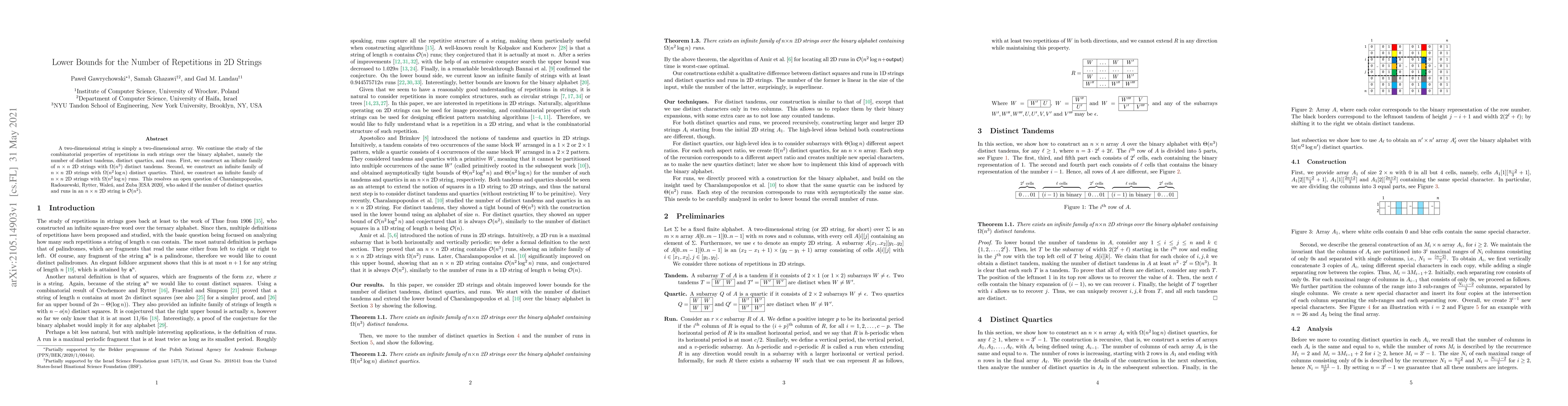 The paper introduces novel constructions of 2D binary strings and provides lower bound theorems for the number of distinct tandems, quartics, and runs, contributing to the theoretical understanding of repetitions in 2D strings.