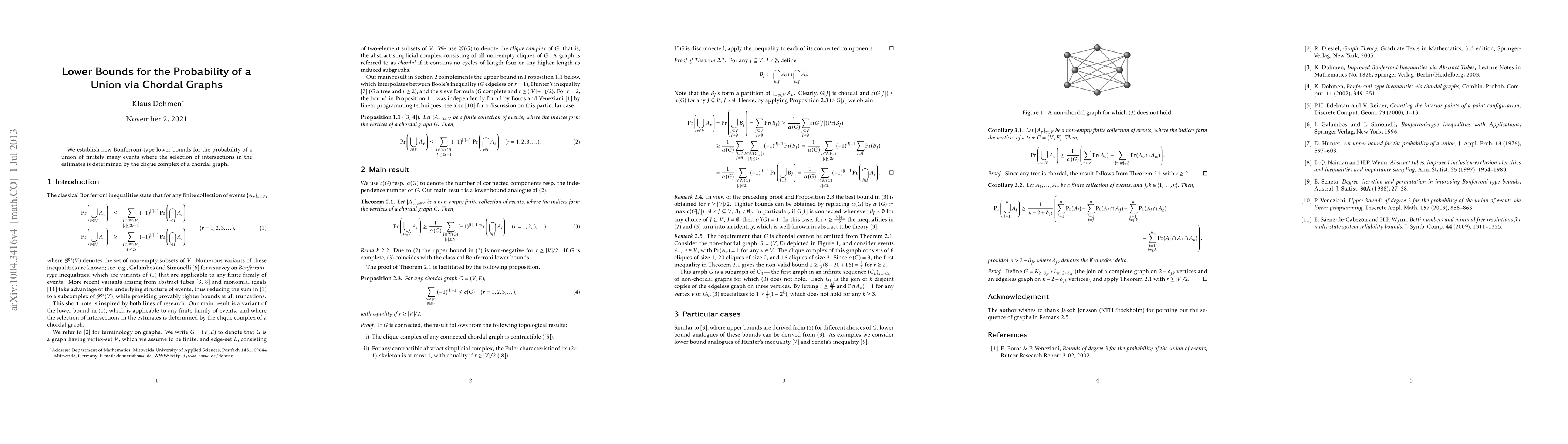 We establish new Bonferroni-type lower bounds for the probability of a union of finitely many events where the selection of intersections in the estimates is determined by the clique complex of a chordal graph.