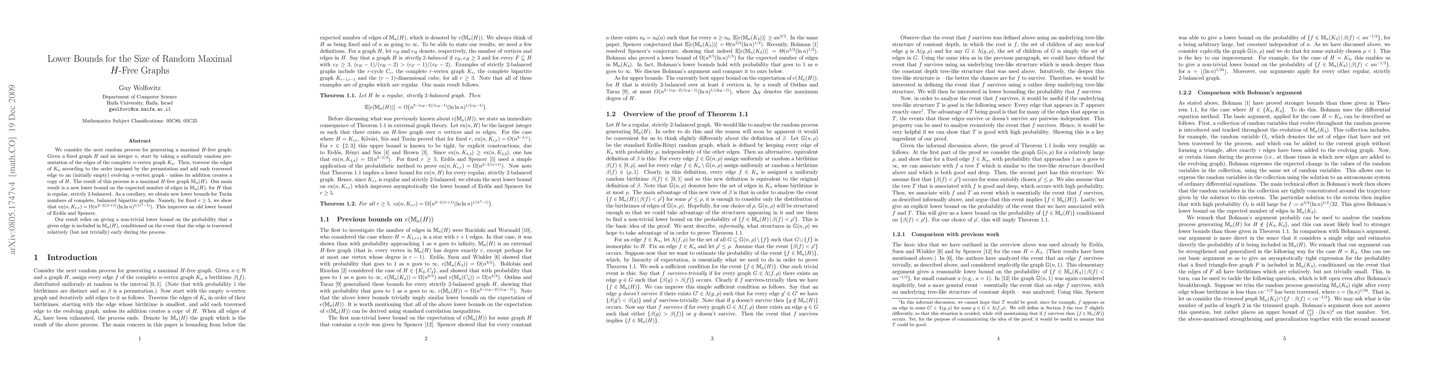 We consider the next greedy randomized process for generating maximal H-free graphs: Given a fixed graph H and an integer n, start by taking a uniformly random permutation of the edges of the complete n-vertex graph. Then, construct an n-vertex graph, M_n(H), iteratively as follows. Traverse the permuted edges of the complete n-vertex graph and add each one to the (initially empty) evolving graph M_n(H) - unless its addition creates a copy of H. The result of this process is a maximal H-free graph M_n(H). The basic question we are concerned with in here is: What is the expected number of edges in M_n(H)? We give new lower bounds on the expected number of edges in M_n(H) for the case where H is a regular, strictly 2-balanced graph. In particular, we obtain new lower bounds for Turan numbers of complete balanced bipartite graphs K_{r,r}, for every fixed r > 4. This improves an old lower bound of Erdos and Spencer.