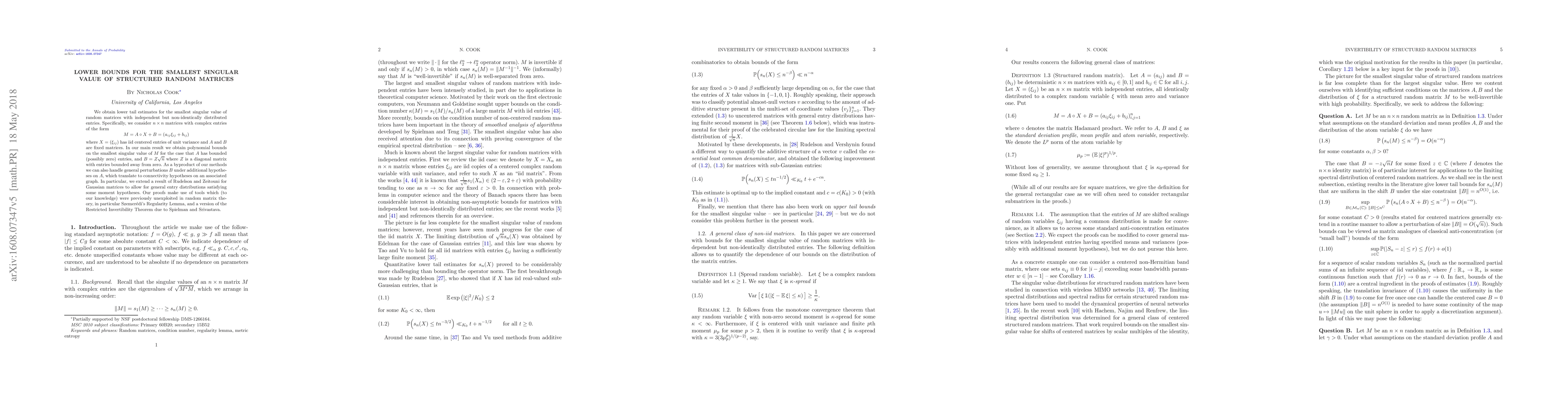 This paper establishes lower tail estimates for the smallest singular value of structured random matrices with non-identically distributed entries. The authors derive polynomial bounds for the singular value under specific conditions on the fixed matrices, extending previous results to more general entry distributions using novel tools like Szemerédi's Regularity Lemma and the Restricted Invertibility Theorem.
