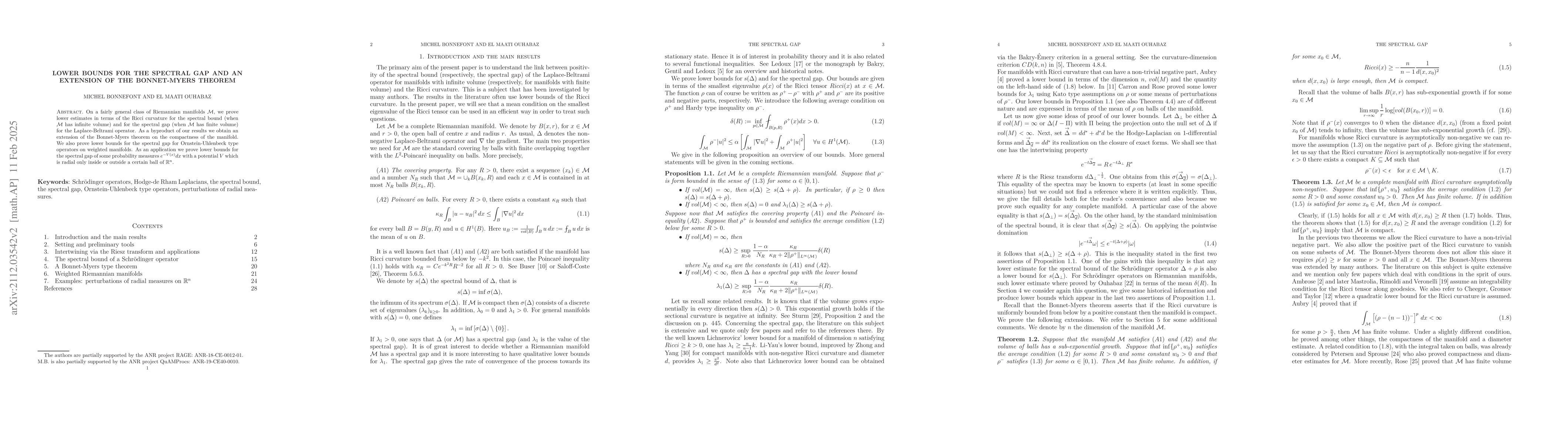 This paper establishes lower bounds for the spectral gap of the Laplace-Beltrami operator on Riemannian manifolds, extending the Bonnet-Myers theorem for compactness. It also provides lower bounds for the spectral gap for Ornstein-Uhlenbeck operators and applies these results to perturbations of radial measures on R^n.