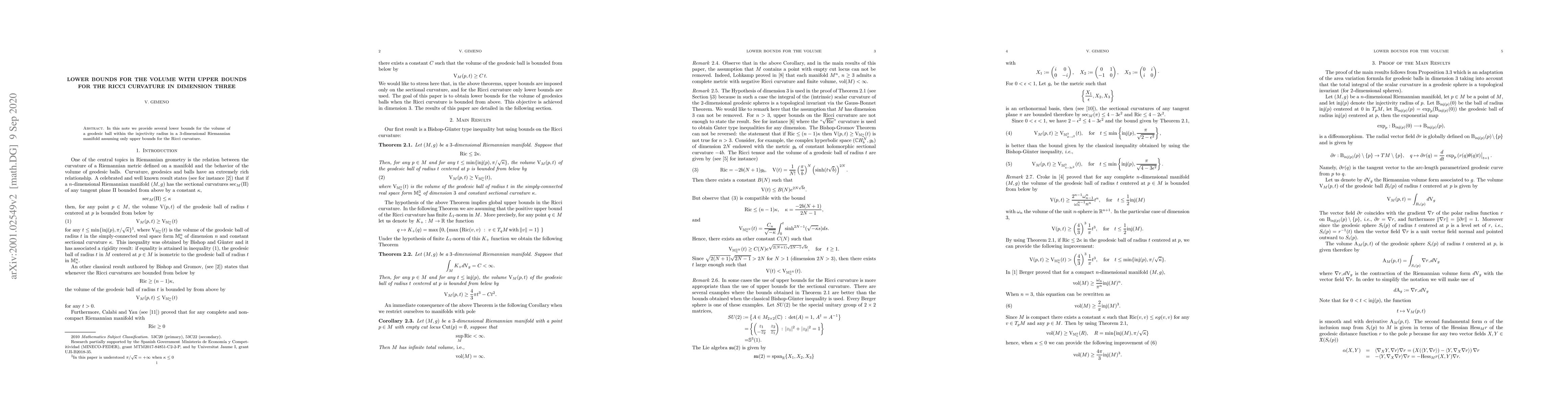 Summary: This paper establishes lower bounds for the volume of geodesic balls within the injectivity radius in three-dimensional Riemannian manifolds under the condition of upper bounds on Ricci curvature. The results provide insights into the geometric properties of such manifolds.