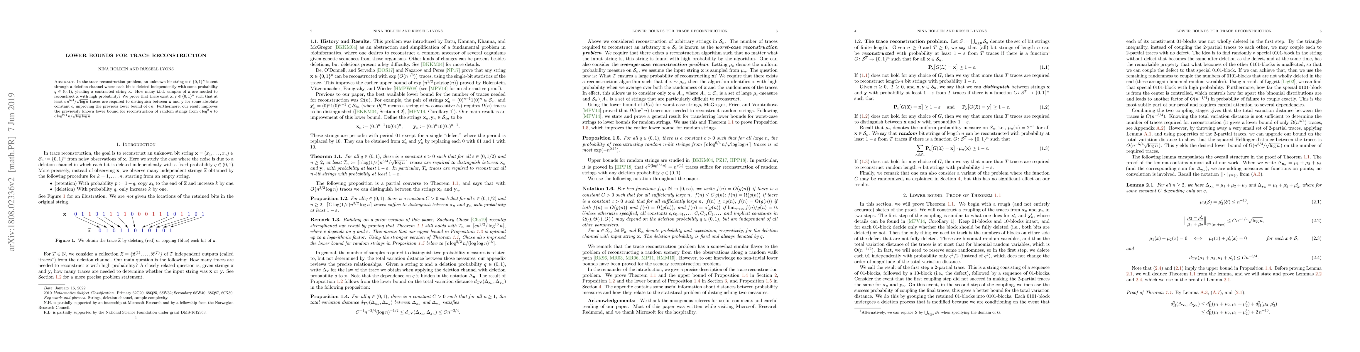 In the trace reconstruction problem, an unknown bit string ${\bf x}\in\{0,1 \}^n$ is sent through a deletion channel where each bit is deleted independently with some probability $q\in(0,1)$, yielding a contracted string $\widetilde{\bf x}$. How many i.i.d.\ samples of $\widetilde{\bf x}$ are needed to reconstruct $\bf x$ with high probability? We prove that there exist ${\bf x},{\bf y} \in\{0,1 \}^n$ such that at least $c\, n^{5/4}/\sqrt{\log n}$ traces are required to distinguish between ${\bf x}$ and ${\bf y}$ for some absolute constant $c$, improving the previous lower bound of $c\,n$. Furthermore, our result improves the previously known lower bound for reconstruction of random strings from $c \log^2 n$ to $c \log^{9/4}n/\sqrt{\log \log n} $.