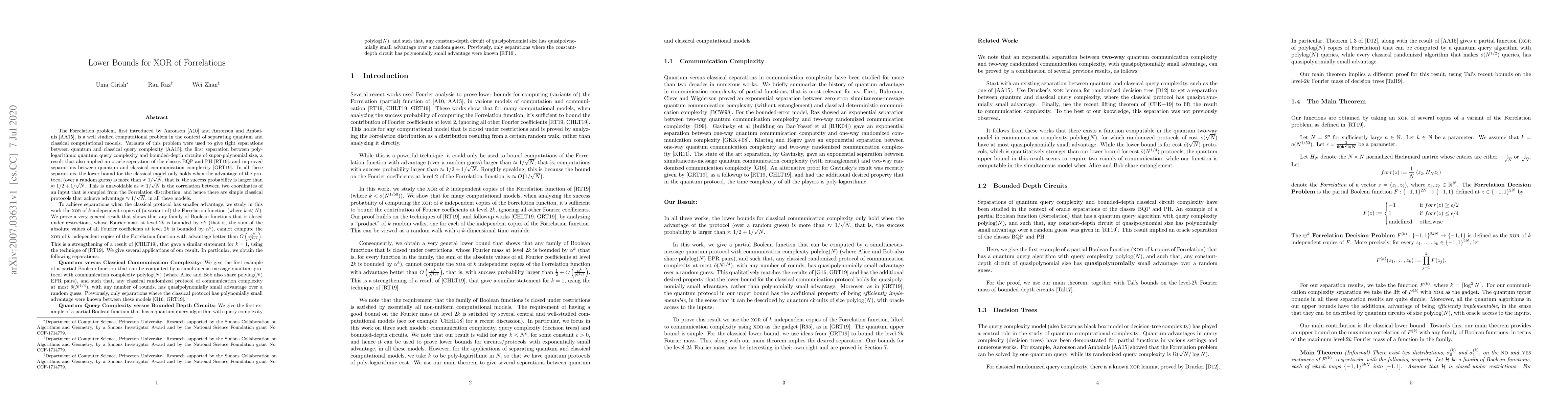 The Forrelation problem, introduced by Aaronson [A10] and Aaronson and Ambainis [AA15], is a well studied problem in the context of separating quantum and classical models. Variants of this problem were used to give exponential separations between quantum and classical query complexity [A10, AA15]; quantum query complexity and bounded-depth circuits [RT19]; and quantum and classical communication complexity [GRT19]. In all these separations, the lower bound for the classical model only holds when the advantage of the protocol (over a random guess) is more than $\approx 1/\sqrt{N}$, that is, the success probability is larger than $\approx 1/2 + 1/\sqrt{N}$. To achieve separations when the classical protocol has smaller advantage, we study in this work the XOR of $k$ independent copies of the Forrelation function (where $k\ll N$). We prove a very general result that shows that any family of Boolean functions that is closed under restrictions, whose Fourier mass at level $2k$ is bounded by $\alpha^k$, cannot compute the XOR of $k$ independent copies of the Forrelation function with advantage better than $O\left(\frac{\alpha^k}{{N^{k/2}}}\right)$. This is a strengthening of a result of [CHLT19], that gave a similar result for $k=1$, using the technique of [RT19]. As an application of our result, we give the first example of a partial Boolean function that can be computed by a simultaneous-message quantum protocol of cost $\mbox{polylog}(N)$ (when players share $\mbox{polylog}(N)$ EPR pairs), however, any classical interactive randomized protocol of cost at most $\tilde{o}(N^{1/4})$, has quasipolynomially small advantage over a random guess. We also give the first example of a partial Boolean function that has a quantum query algorithm of cost $\mbox{polylog}(N)$, and such that, any constant-depth circuit of quasipolynomial size has quasipolynomially small advantage over a random guess.
