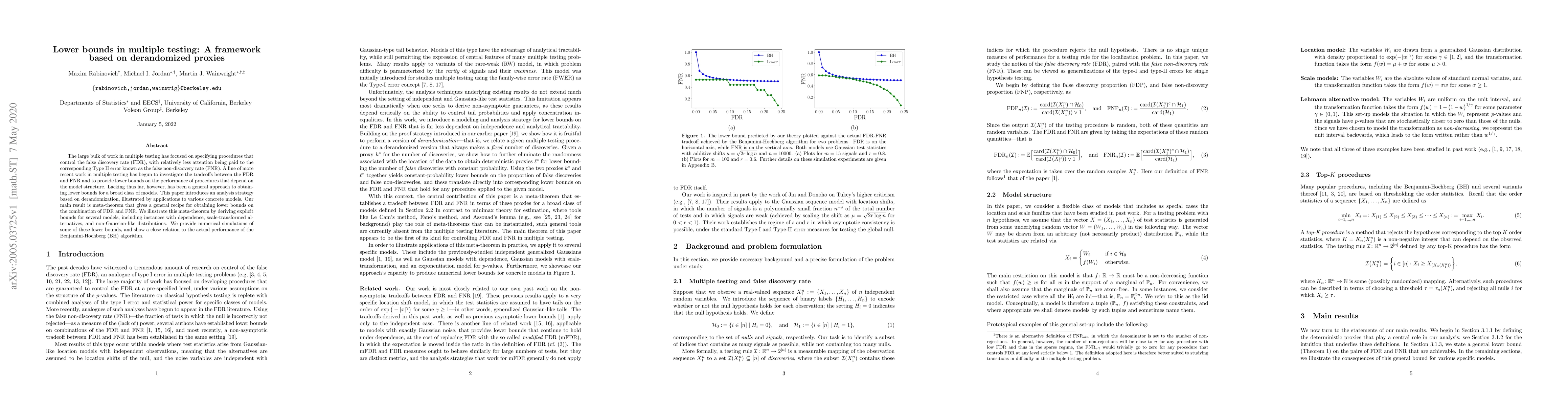 The large bulk of work in multiple testing has focused on specifying procedures that control the false discovery rate (FDR), with relatively less attention being paid to the corresponding Type II error known as the false non-discovery rate (FNR). A line of more recent work in multiple testing has begun to investigate the tradeoffs between the FDR and FNR and to provide lower bounds on the performance of procedures that depend on the model structure. Lacking thus far, however, has been a general approach to obtaining lower bounds for a broad class of models. This paper introduces an analysis strategy based on derandomization, illustrated by applications to various concrete models. Our main result is meta-theorem that gives a general recipe for obtaining lower bounds on the combination of FDR and FNR. We illustrate this meta-theorem by deriving explicit bounds for several models, including instances with dependence, scale-transformed alternatives, and non-Gaussian-like distributions. We provide numerical simulations of some of these lower bounds, and show a close relation to the actual performance of the Benjamini-Hochberg (BH) algorithm.