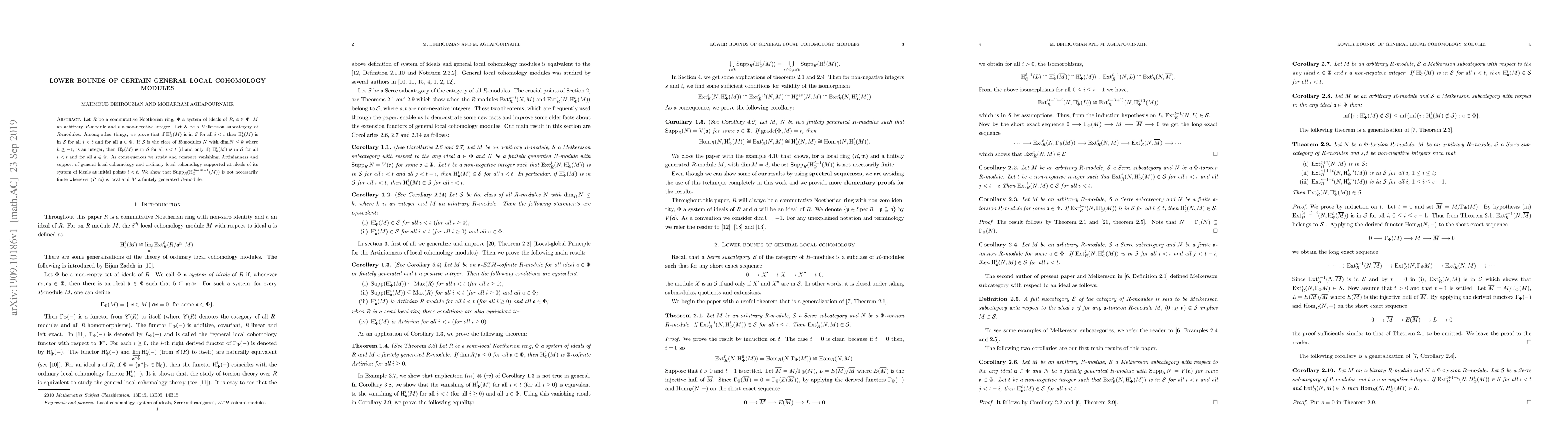 This paper proves that if general local cohomology modules $lc^{i}_Phi(M)$ belong to a specific module category $mathcal{S}$ for all $i < t$, then ordinary local cohomology modules $lc^{i}_a(M)$ also belong to $mathcal{S}$ for all $i < t$ and for all $a in Phi$. The research further examines vanishing, Artinian properties, and supports of these cohomology modules, showing that the support of $lc^{dim M-1}_{Phi}(M)$ can be non-finite in certain local rings and modules.