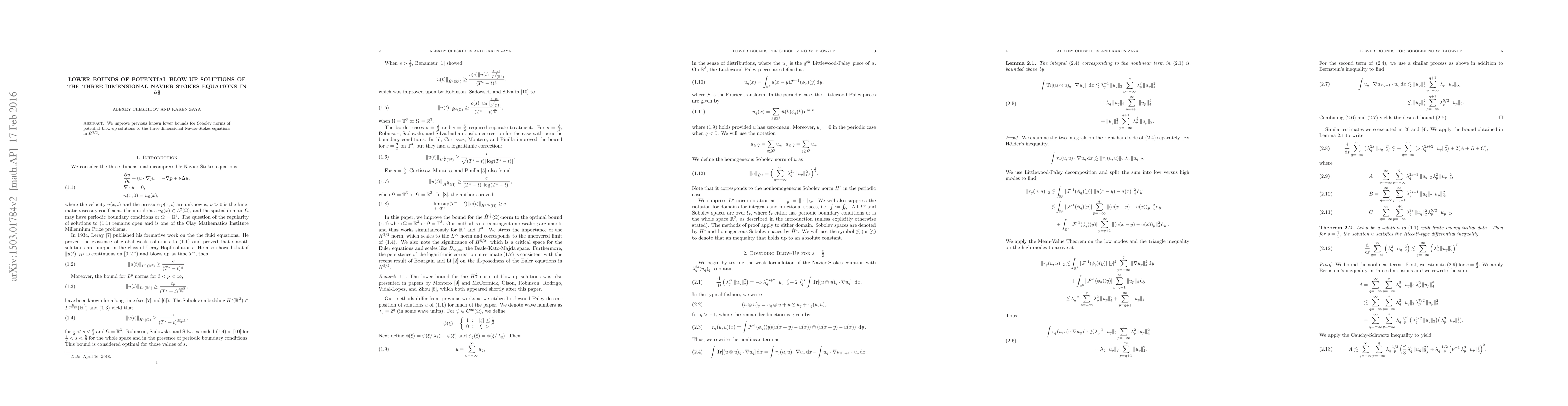 We improve previous known lower bounds for Sobolev norms of potential blow-up solutions to the three-dimensional Navier-Stokes equations in $\dot{H}^\frac{3}{2}$. We also present an alternate proof for the lower bound for the $\dot{H}^\frac{5}{2}$ blow-up.